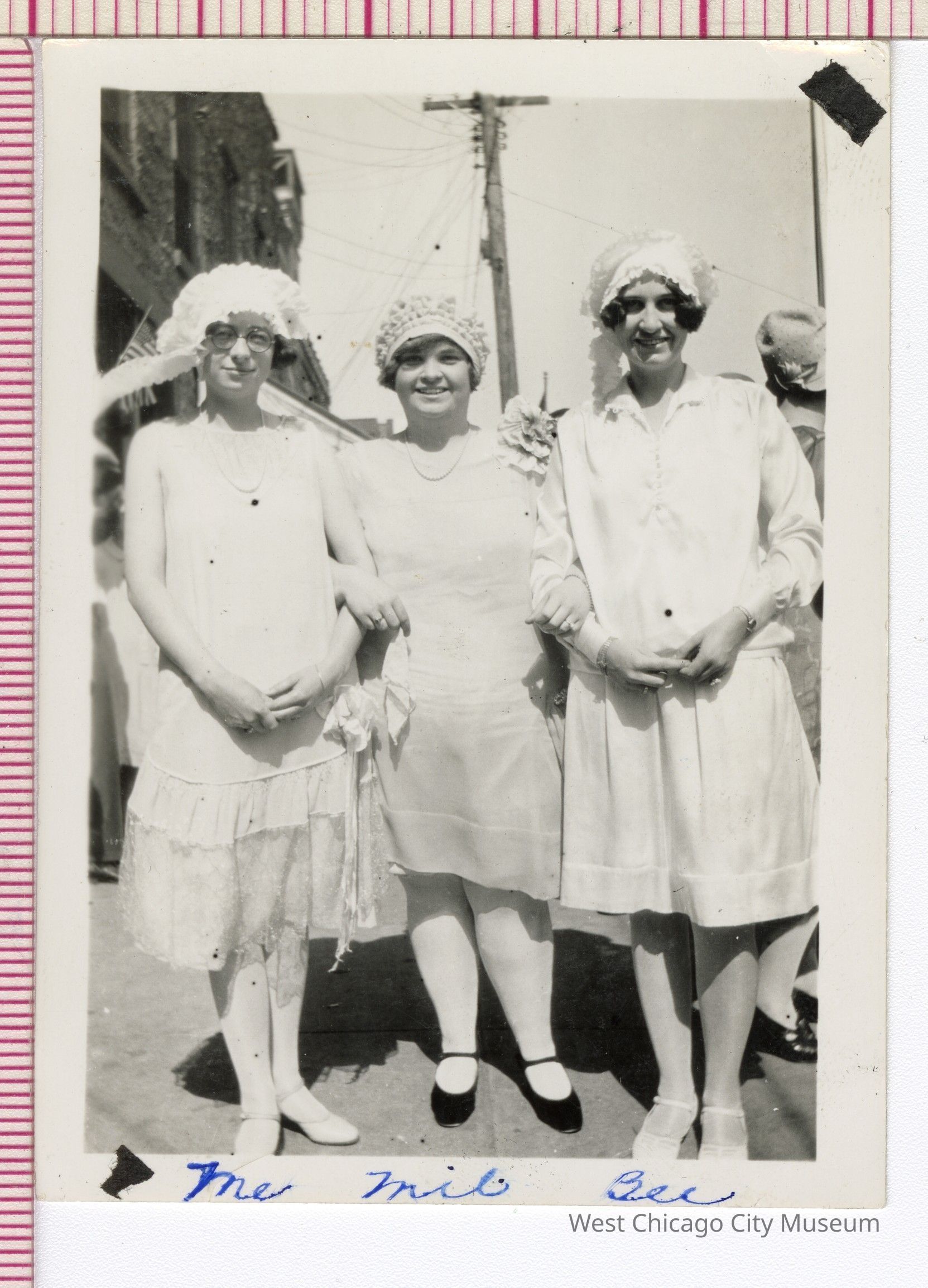 Photo, B&W: Annual Homecoming Day, September 5, 1927: L to R: Marion Goetz, Mildred Haffron and Berniece Hensel September 5, 1927, Annual Homecoming Day. Taken on Depot Street looking north. Wooden tower on City Hall, 132 Main St. can be seen at upper leftPhotograph Details