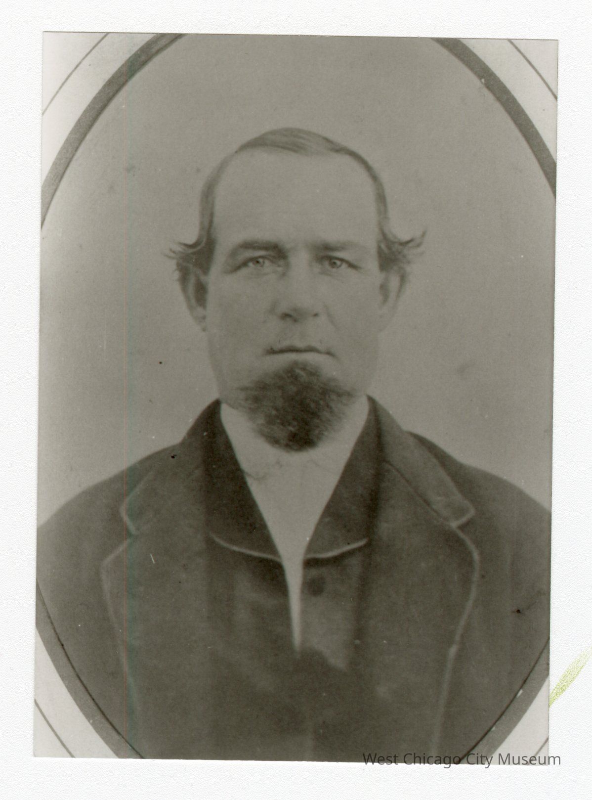 Black and white portrait of a man with beard only on his chin. Wearing coat. Hair curling out above ears. Looks like in circular frame then got cropped.