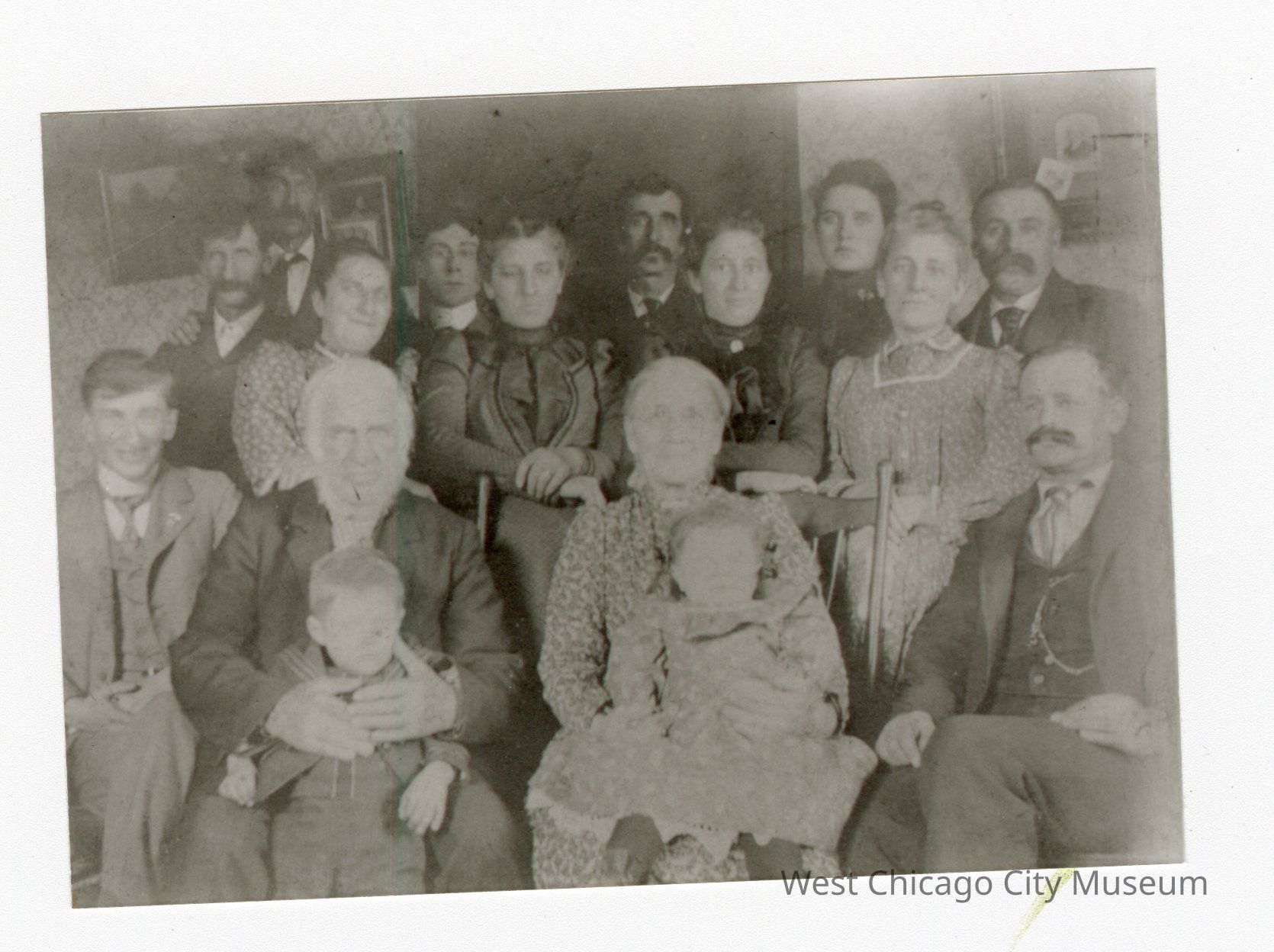 Black and white photograph of a group of people inside. Two children on laps of adults in front row. 14 adults. 4 adults sitting in front row, 4 women standing behind them resting their arms on the backs of their chairs, 4 men and one woman standing behind them, and one man in way back on left resting hand on man's shoulder before him.Collection
