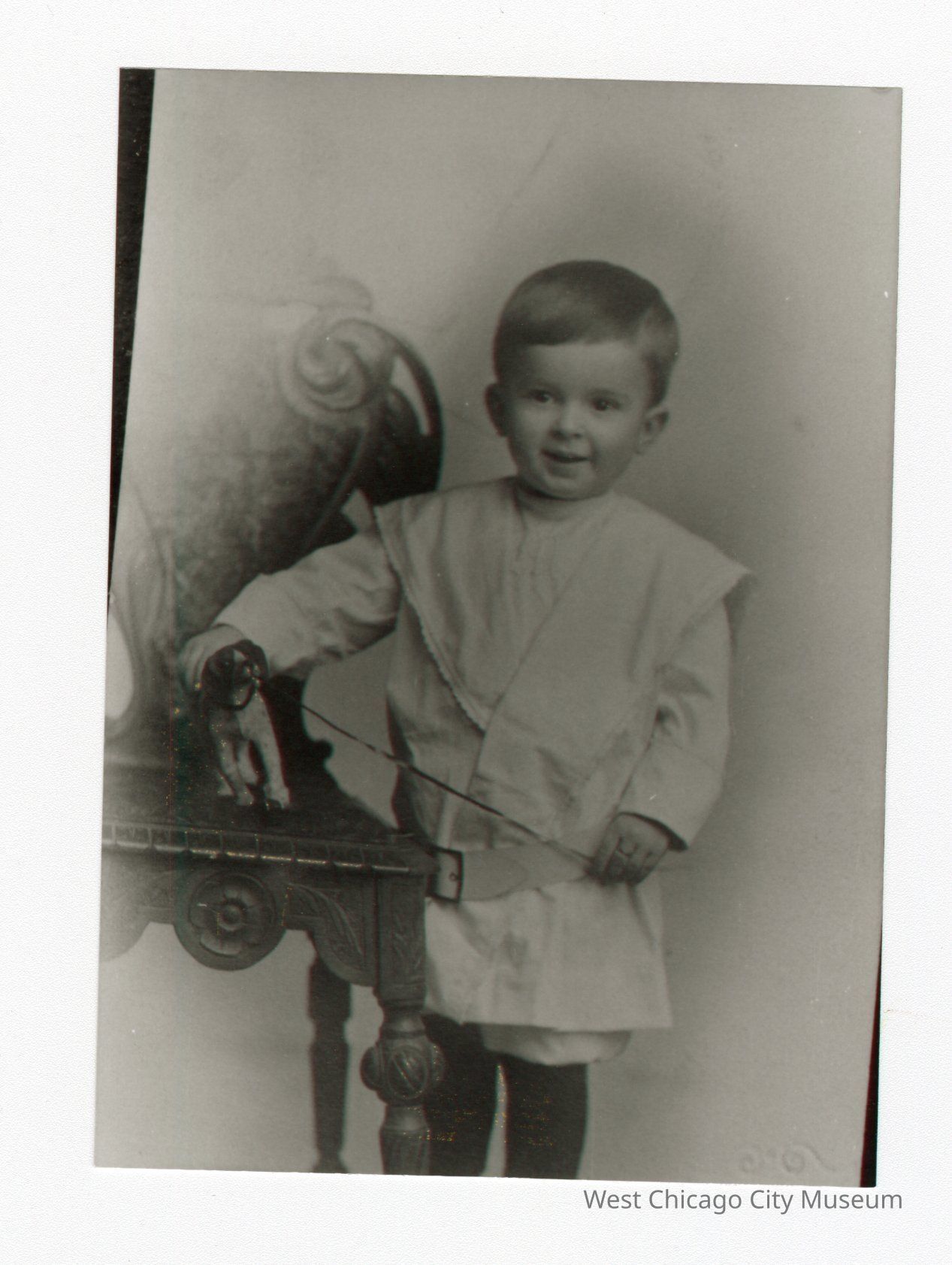 Black and white photo of young boy in all white holding leash of toy dog in one hand and other hand is resting on top of toy dog that's on a chair.