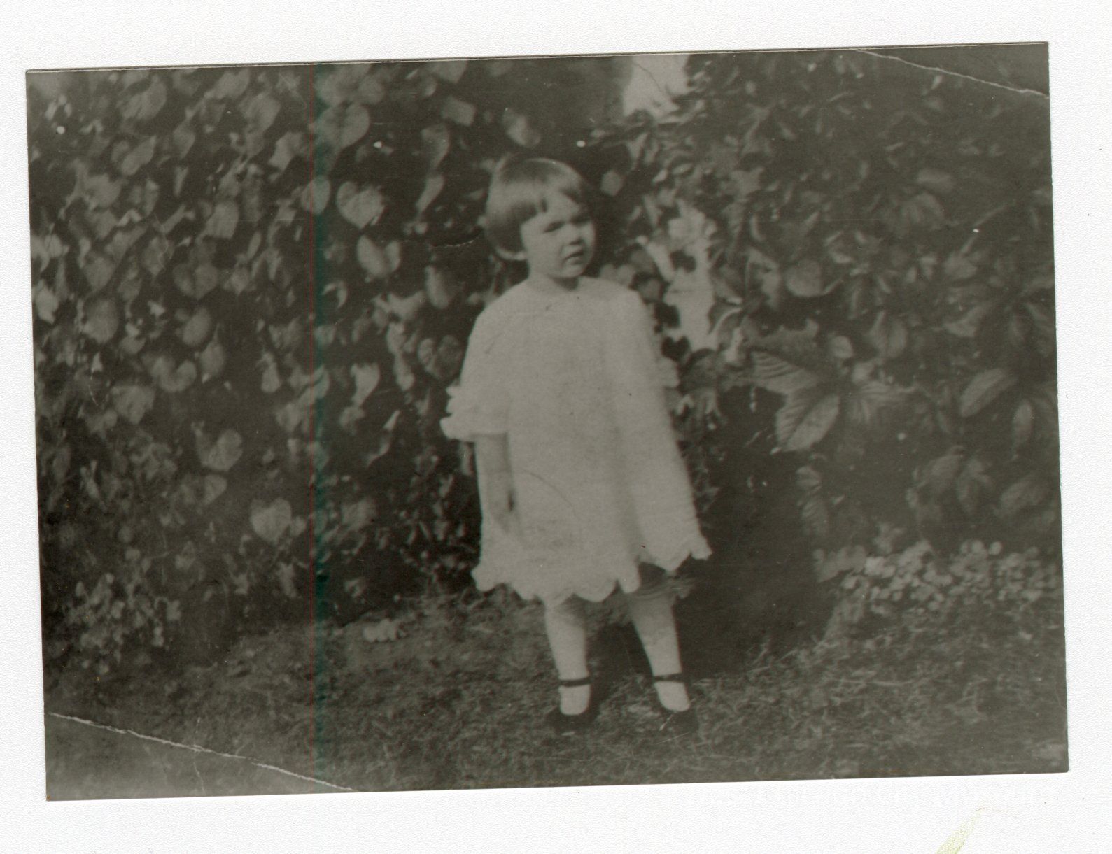 Black and white photo of young girl in white dress standing in front of leaves of plants. Black shoes with straps. She's looking off to the right.