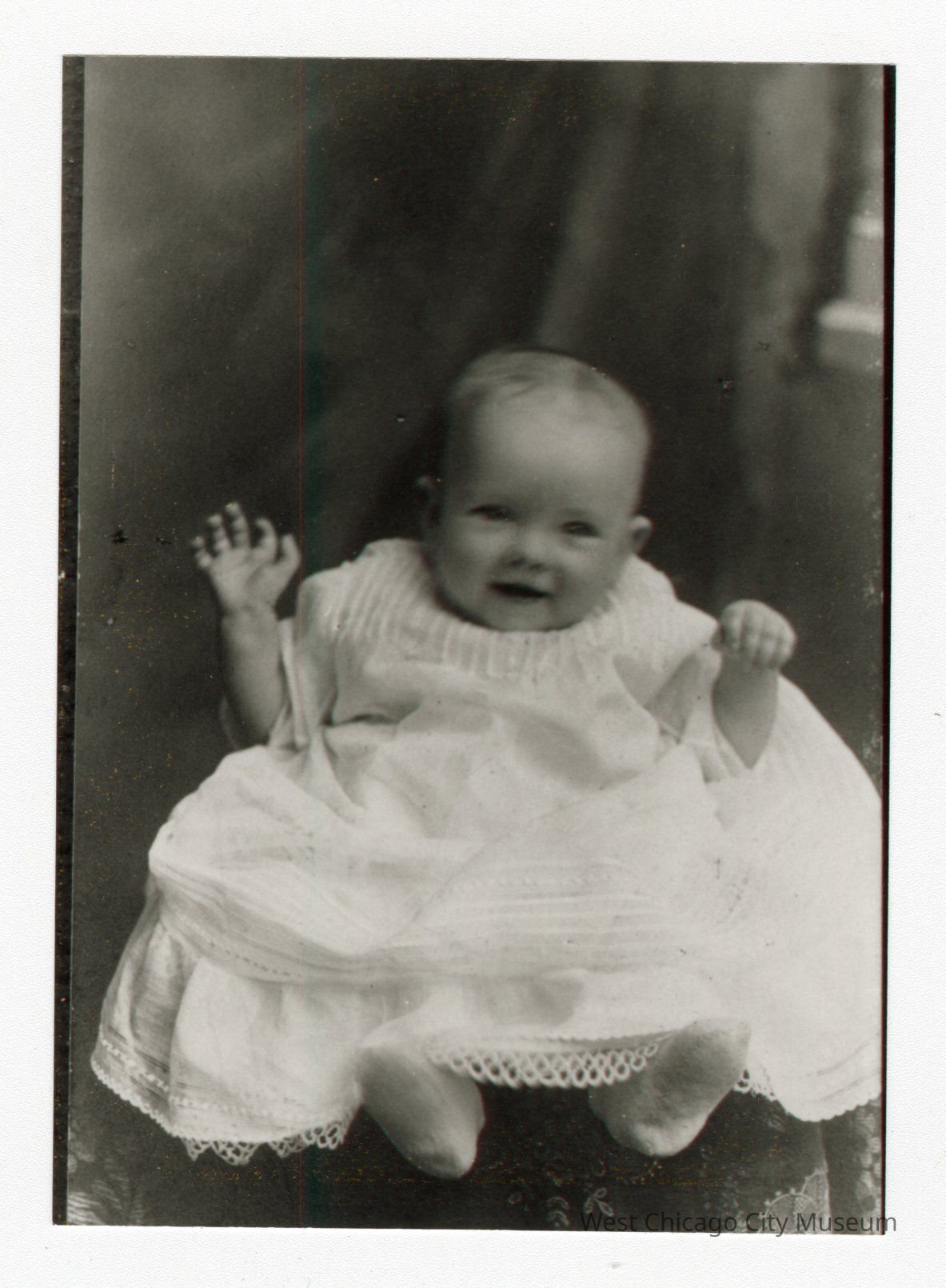 Black and white photo of baby in shite dress holding both hands up sitting in front of some dark draped cloth.