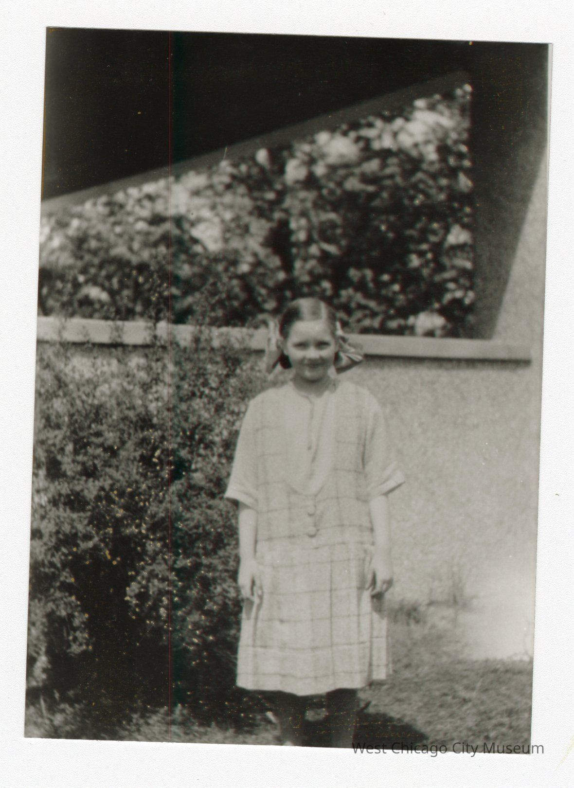 Black and white photo of girl in dress with sleaves at her elbows in center looking at photographer. Shrub behind her on left about the saem height as wall behind her, which domes up to mid-head height. Trees in background behind that wall-like structure.Collection