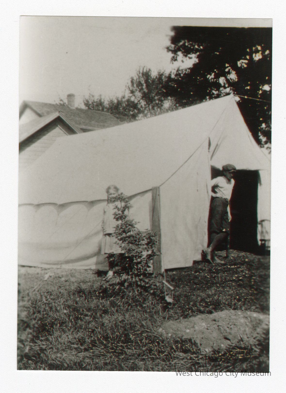 Black and white photo of boy leaning against pole in doorway of tent with one leg grossed over other and hand on hip as he stands. He's facing right. Girl standing facing camera along edge of tent behind small tree. House and trees in background behind tent.Collection