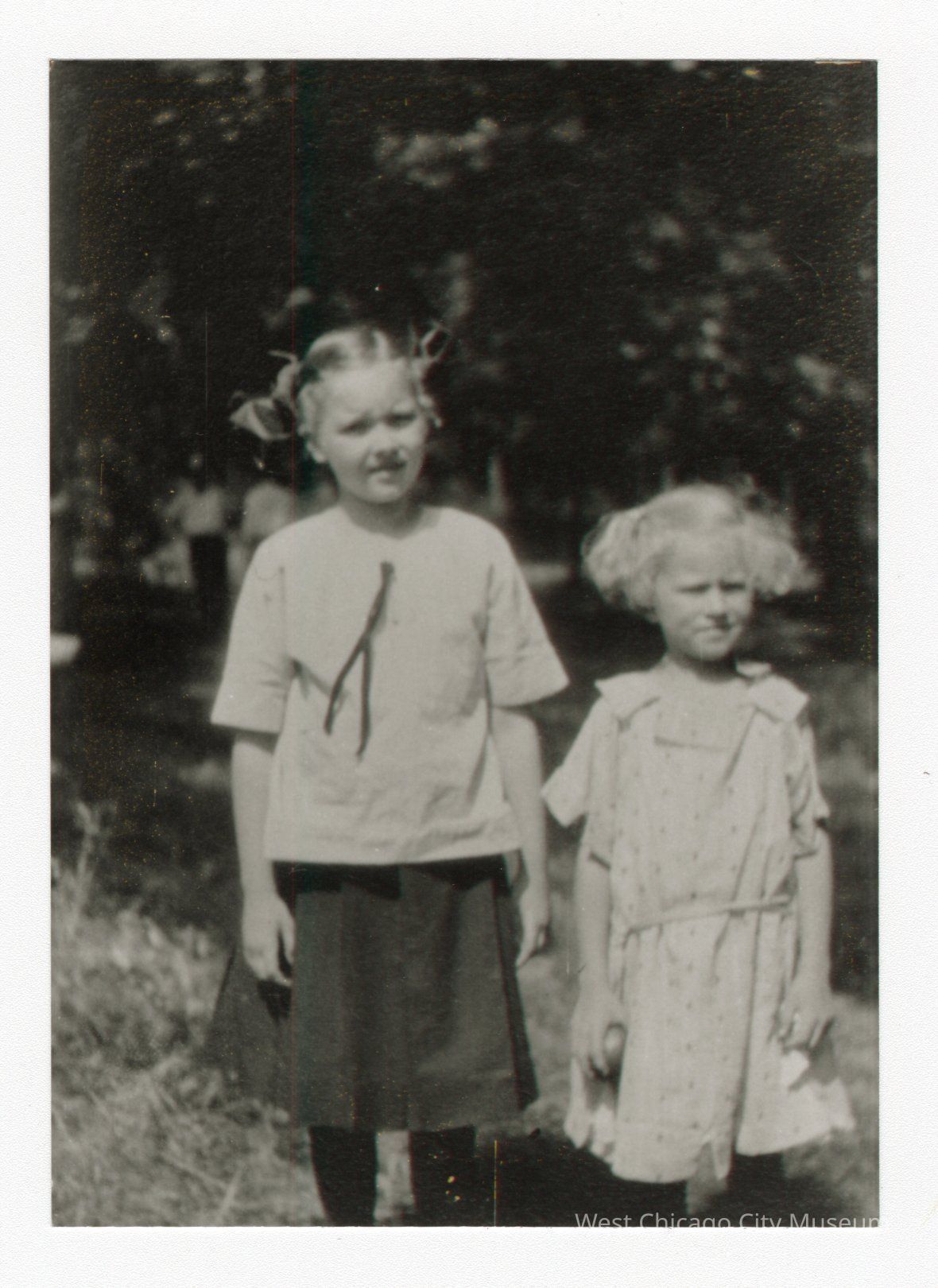 Black and white photo of two girls slightly squinting. Girl on right is holding something in her right hand and in all light colors, girl on left has white top and dark skirt. Leafy tree in background.Collection