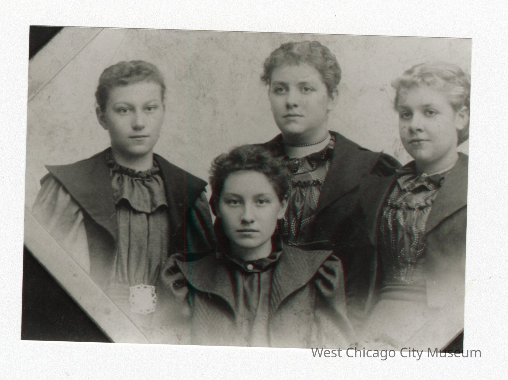 Black and white photo of four women in all black. Three are standing shoulder to shoulder and one is in center, likely sitting staring right at photographer. Black corners in the top left, bottom left, and bottom right corners all different sizes.Collection