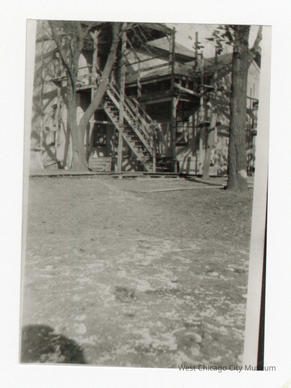 Black and white photo of scaffolding on house with house in background and barely visible. Bottom half of photo is of the gound. Shadow of photographer's head and hands taking the photo in bottom left corner of photo.Collection