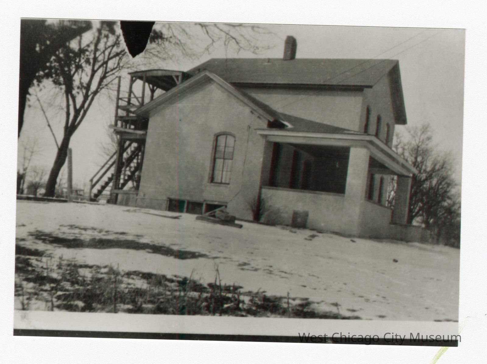 Black and white photo of house with snow on ground in foreground. Porch on right, front of house facing right. Bare trees in background. One window on side of house. What looks like scaffolding on left, behind house.Collection