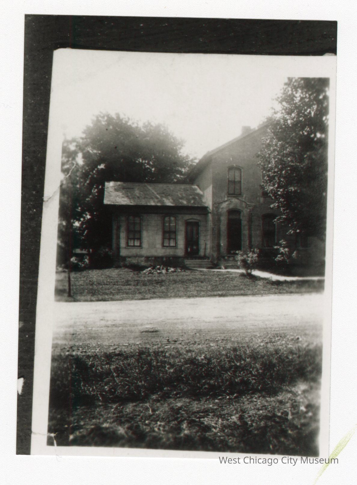 Black and white photo of house with road in front of it. Grass in foreground. Right side of house blocked by tree with leaves along right edge of photo taller than house. Trees with leaves in background behind house.Collection