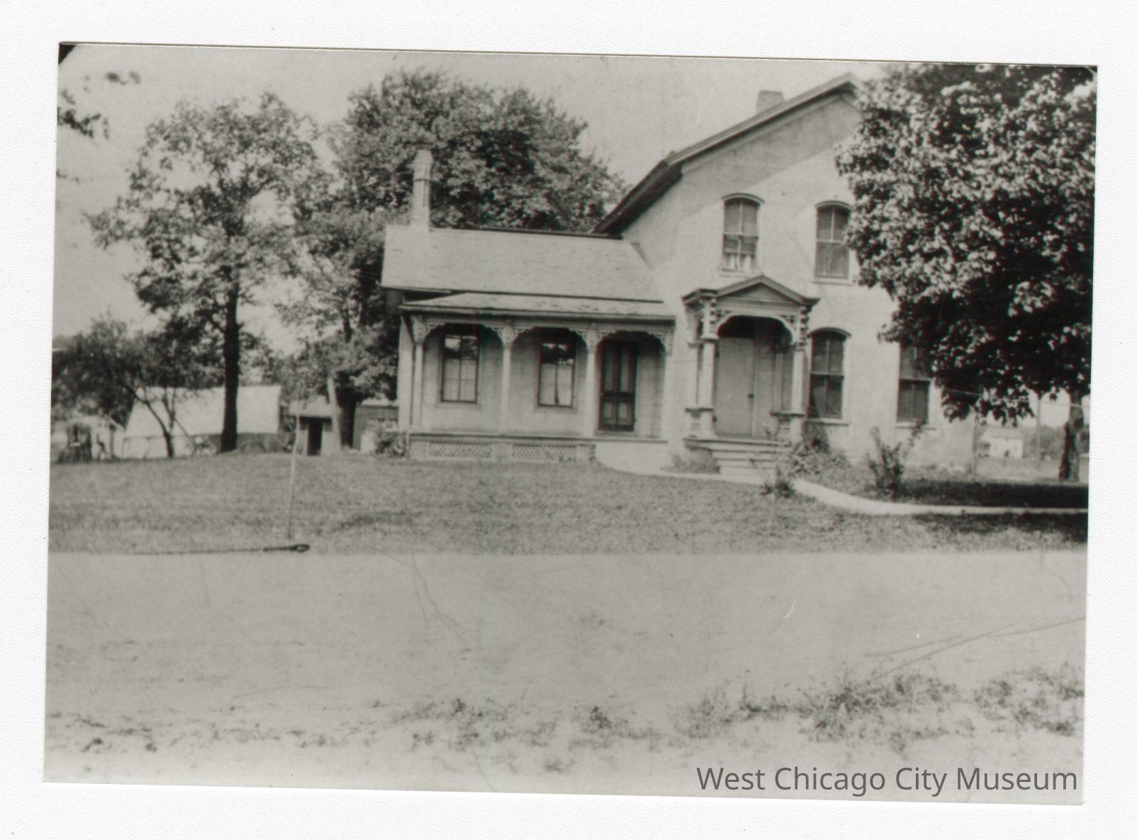 Black and white photo of house with porch on left. Tree in top right corner with leaves. Road in foreground bottom third of photo. Trees behind house and on left.Collection