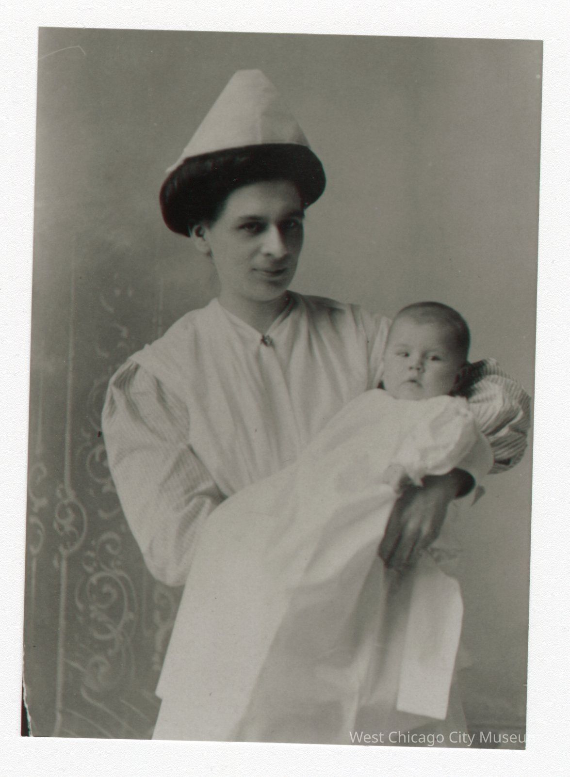 Black and white photograph of woman in all white with white nurse's hat holding a baby in all white. Baby's head is closer to right edge of photo.