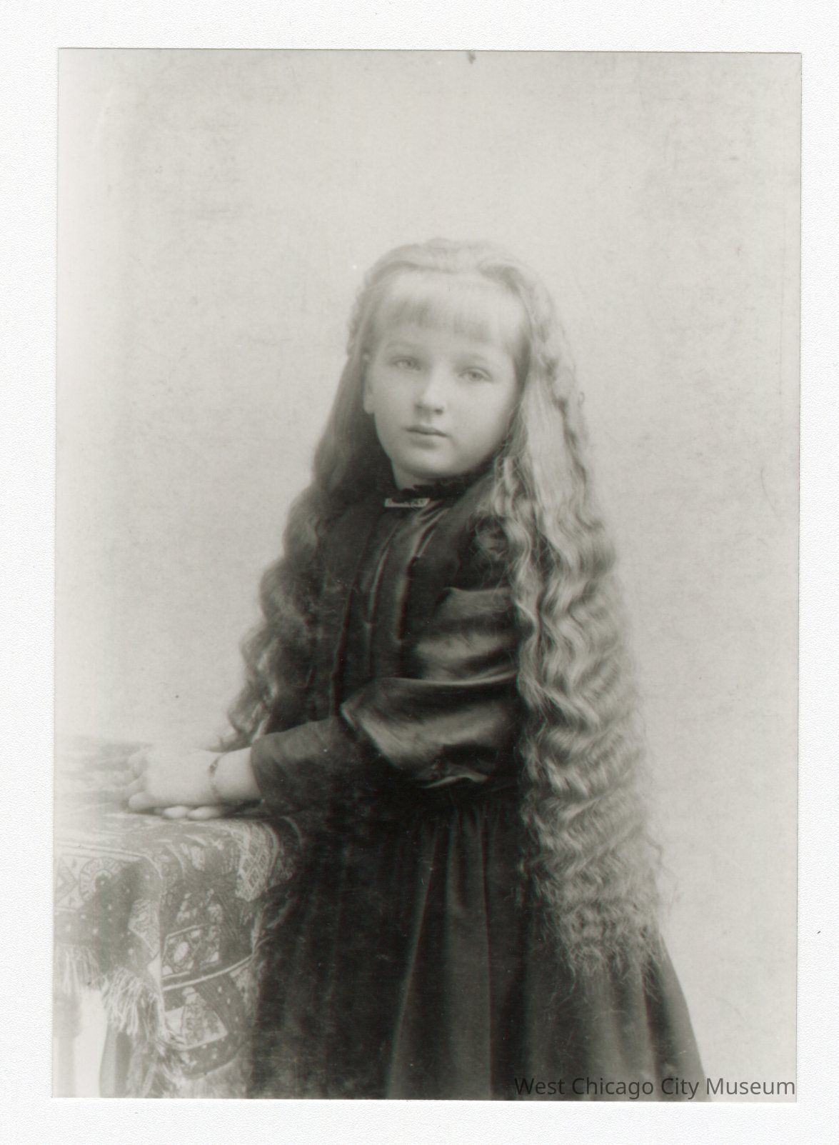 Black and white photo of a young girl with very long wavy hair and bangs standing with her arms resting on a surface on the left and head turned. She's wearing a black dress.Collection