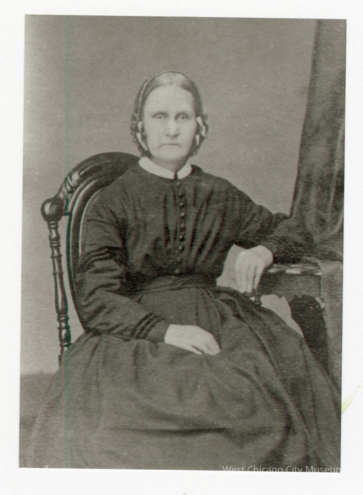 Black and white photo of woman in black dress with 9 round buttons from neck to waist sittin gin chair. Arm on left is resting in her lap and other arm is resting on a table beside her.Collection