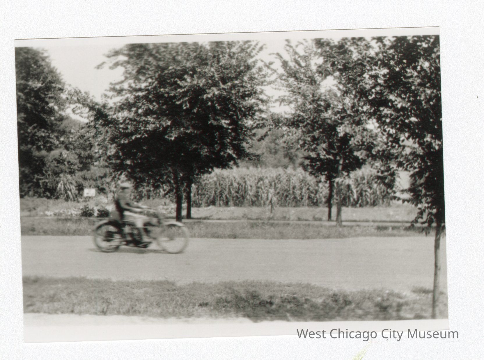 Black and white photo of man on motorcycle going l to r on street, blurry. Grass along bottom edge. Grass and trees and plants in background.