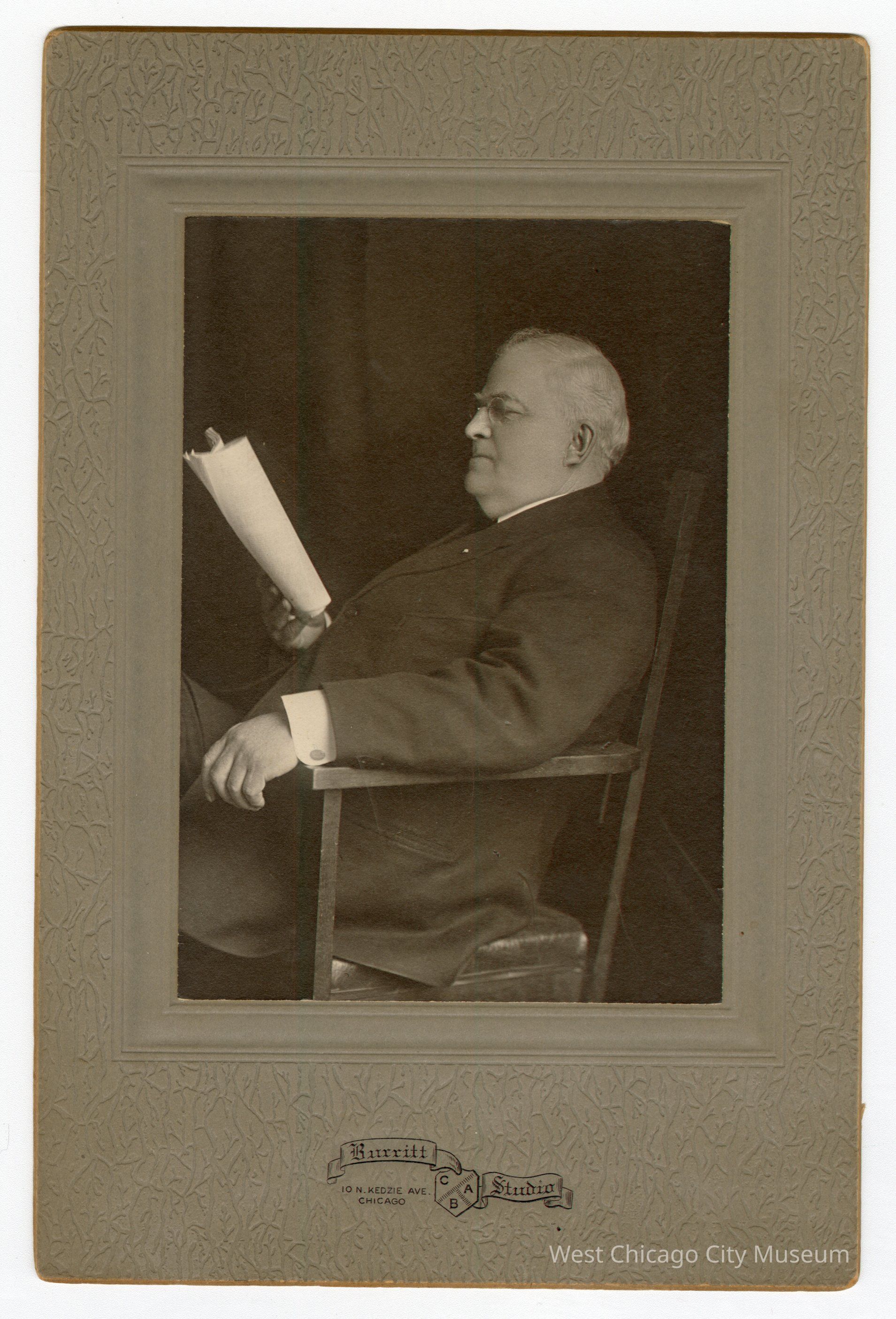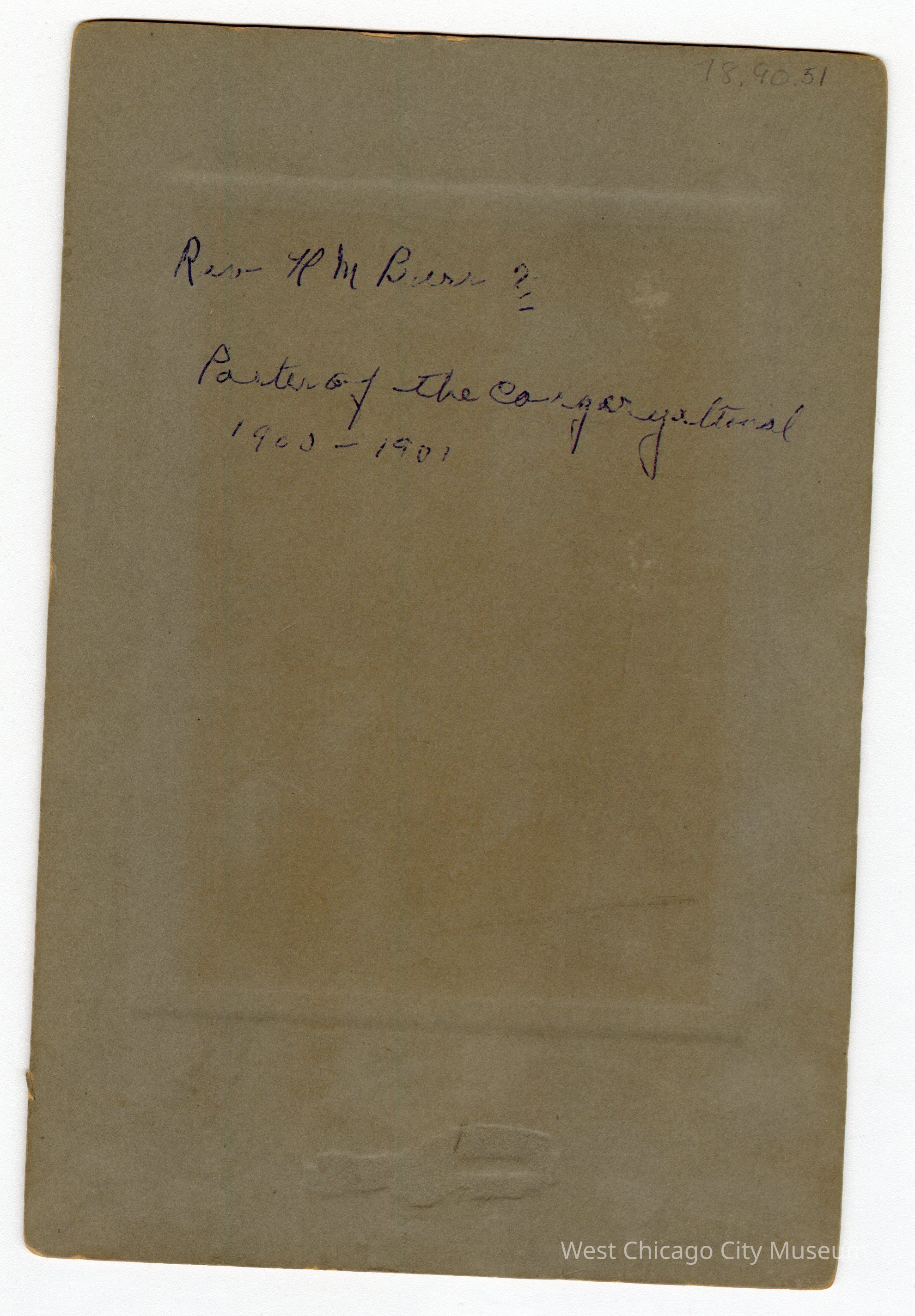 Photo, b&w, 8 7/8" x 5 7/8" (including mounting); on front is Burritt Studio 10 N. Kedzie Ave. Chicago on back is written in ink, "Rev H M Burr Pastor of the Congregational - 1900-1901"Photograph Details