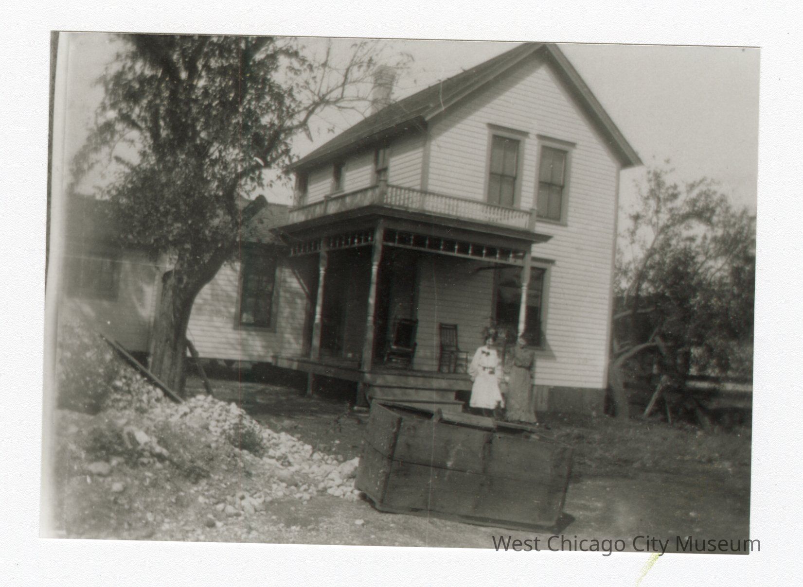Black and white photo of two women standing on steps of porch in front of house. Chairs in background on porch. Pile or rubble in bottom left corner. Wooden box-looking object front and center in front of women. Tree on left with leaves.Collection