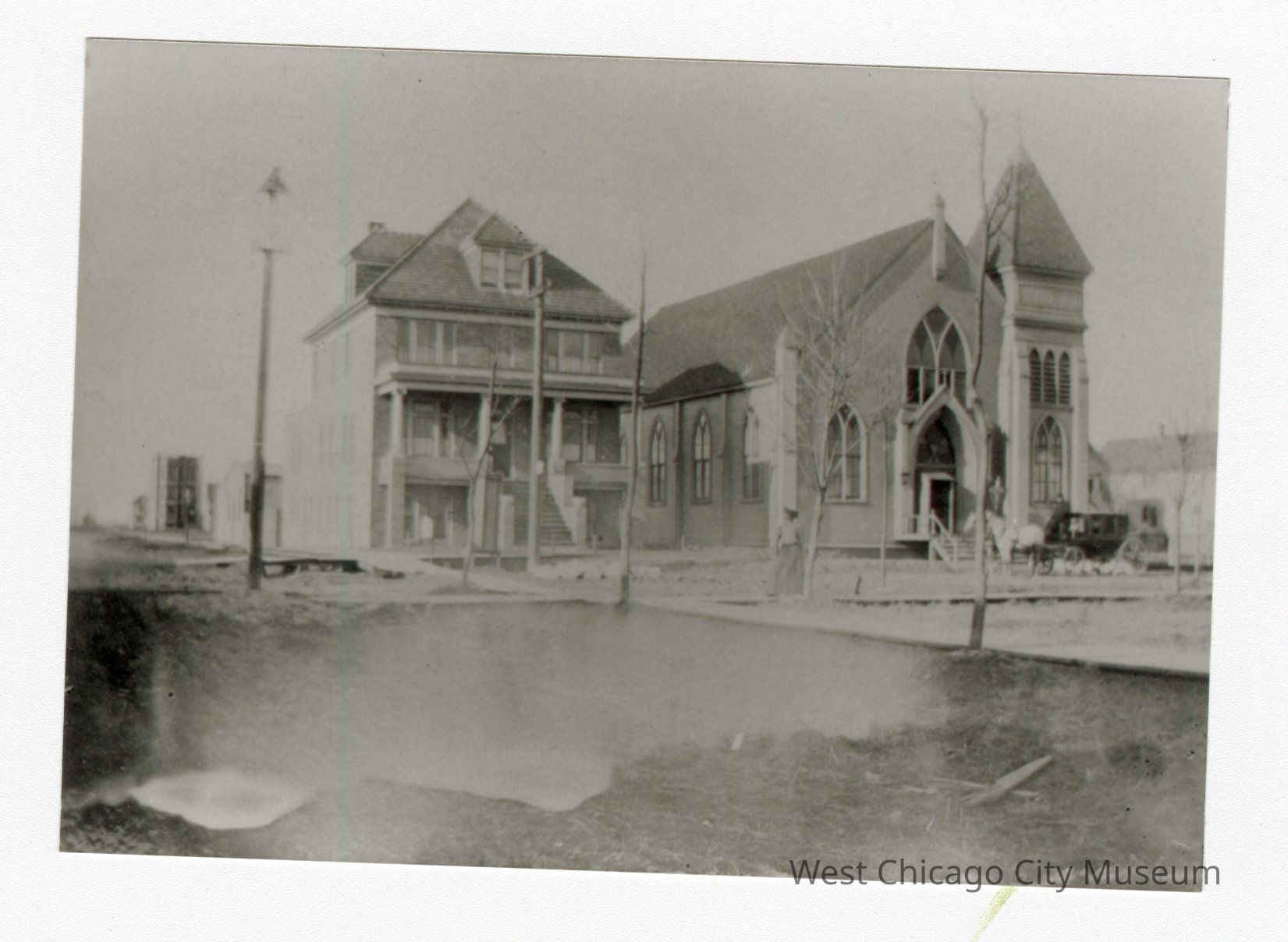 Black and white photo of two buildings. Building on right looks to be church with horse and buggy in front. Horse is light color. Facing left