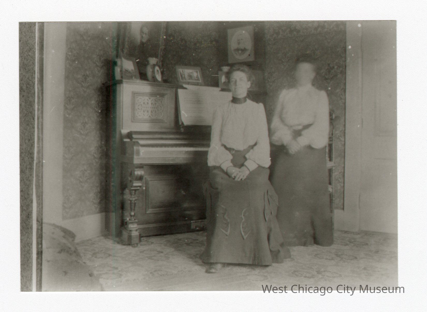 Black and white photo of two woman in front of piano. Woman closer to center sitting, dark skirt, white blouse, hands resting in lap. Woman on right similar position, but looks to be standing. Face is blurry. White door along right edge of photo.Collection
