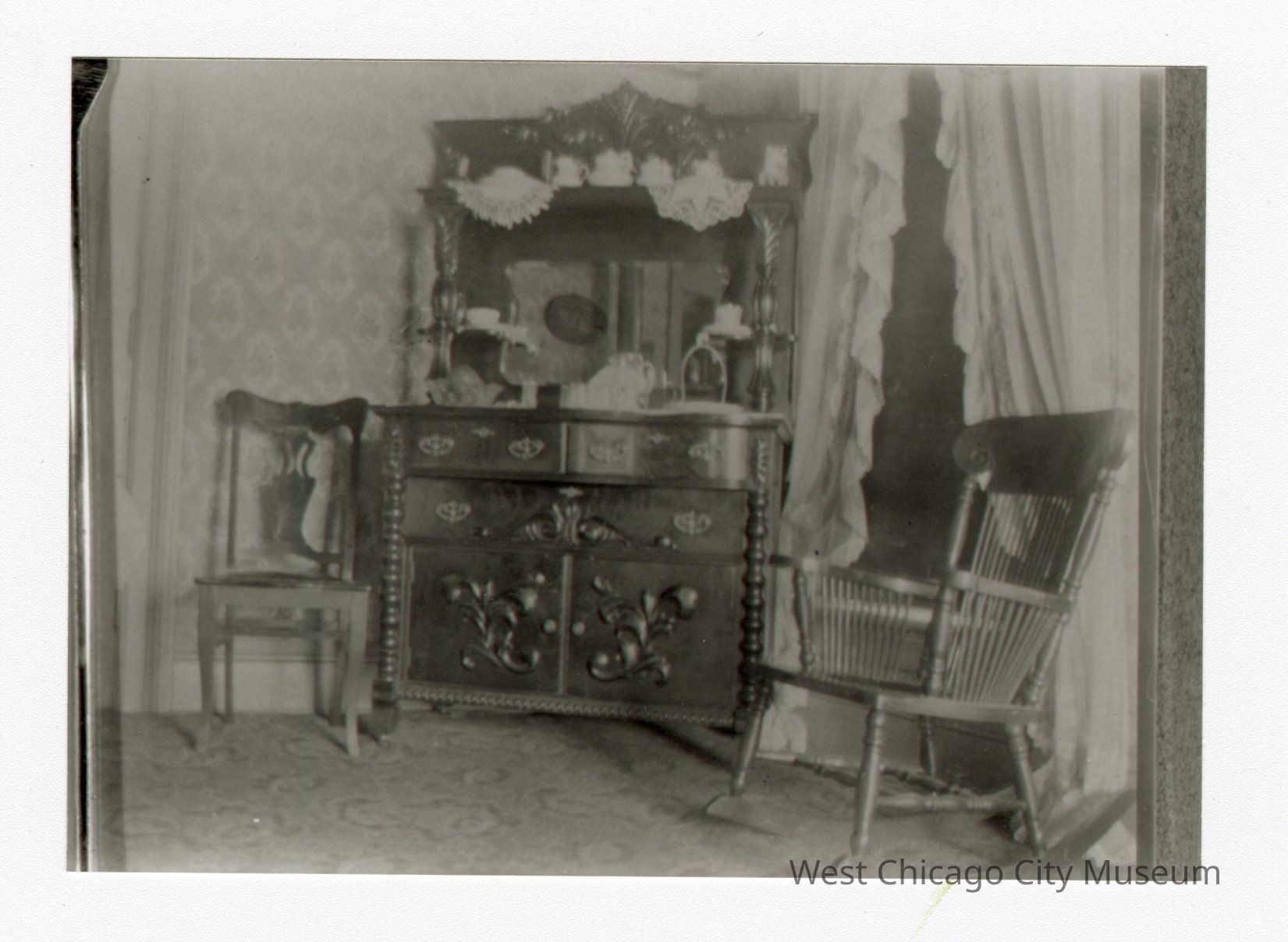Black and white interior photo of rocking chair on right, dresser / cabinet in middle, and wooden chair on left. Window with curtains behind and to left of rockign chair.Collection