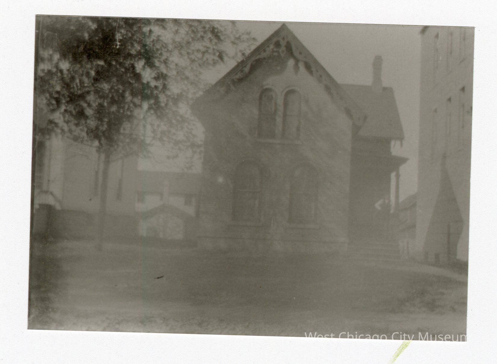 Black and white photo of house with building on right along ede of photo and another buliding on left. Tree with leaves on left. Facade of house two windows on ground level with two above. The two above are closer together and narrower when compared to the two on the bottom. Stairs on right along side of building. Grass in bottom quarter of photo.Collection