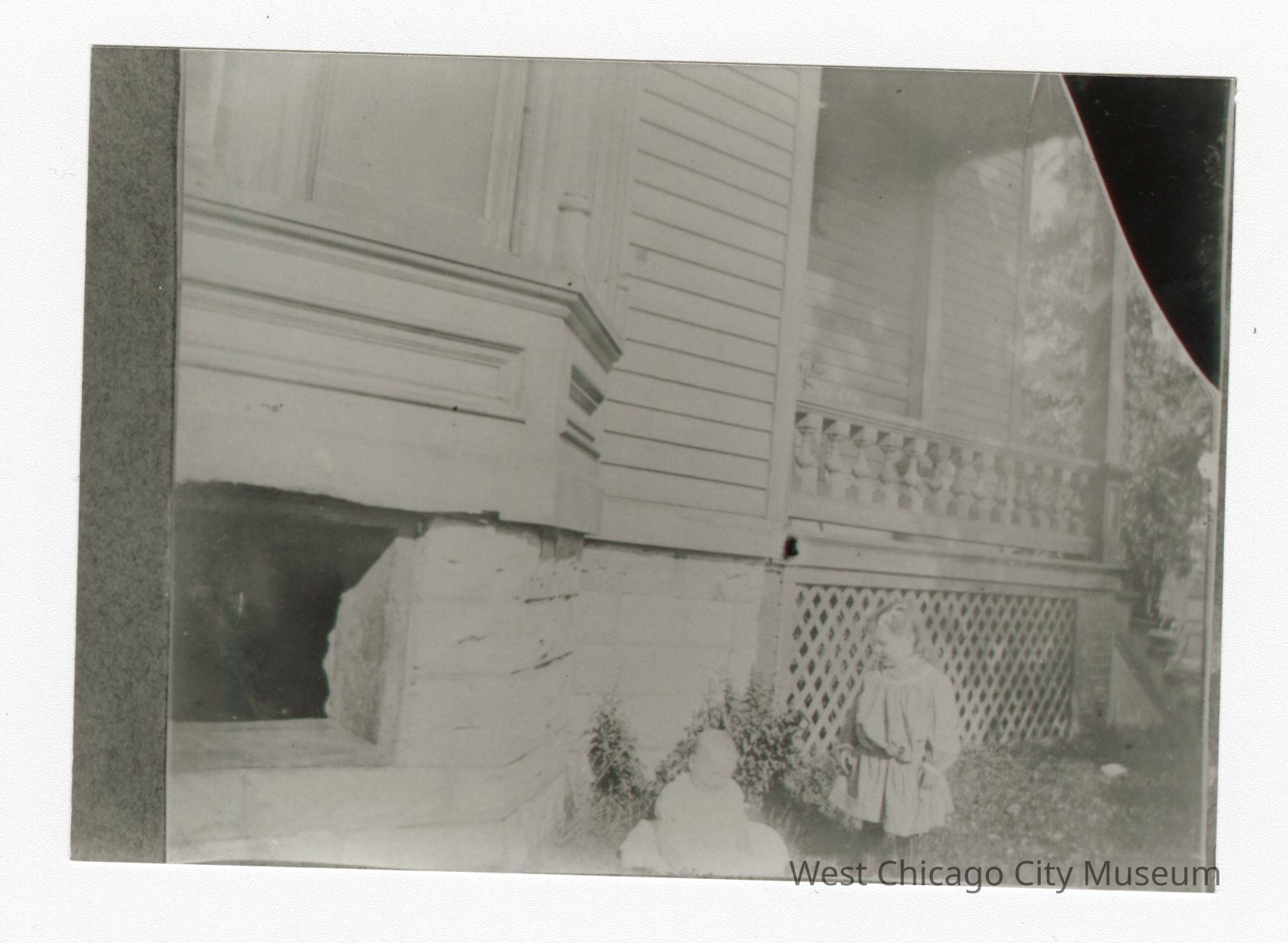 Black and white photo of two children in front of a house. Younger child on left sitting on ground adn older girl on right looking down at younger child. Porch behind girl on right.Collection