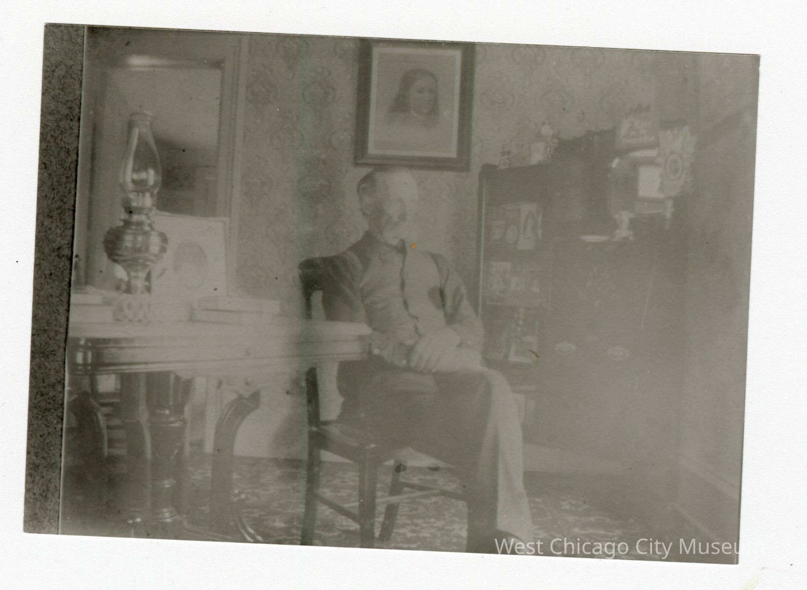 PTC From the Estate of Norma Fairbank, grew up at 406 Joliet (54 Joliet), parents Ralph and Rhoda Fairbank bought home in 1906 or 1907: Black and white photo of man sitting in parlor, one leg crossed over other and on hand resting on other arm. Sitting in a wooden chair and table along left edge of photo with lmp on it. Framed portrait of a woman on wall above his head and slightly to the right. His feet are cut off along the bottom edge of the photo at the ankle. Furniture in corner of room to right.Collection
