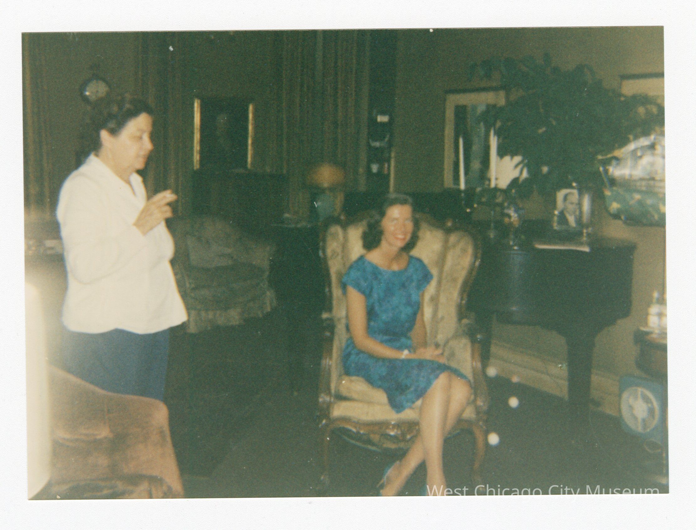 Color photograph with white border. Woman in blue knee-height dress sitting on chair with ankles crossed and hands in lap. Woman in white shirt with clock overhead facing right smoking. On back red stamp processed by Kodak Sep 1988Collection