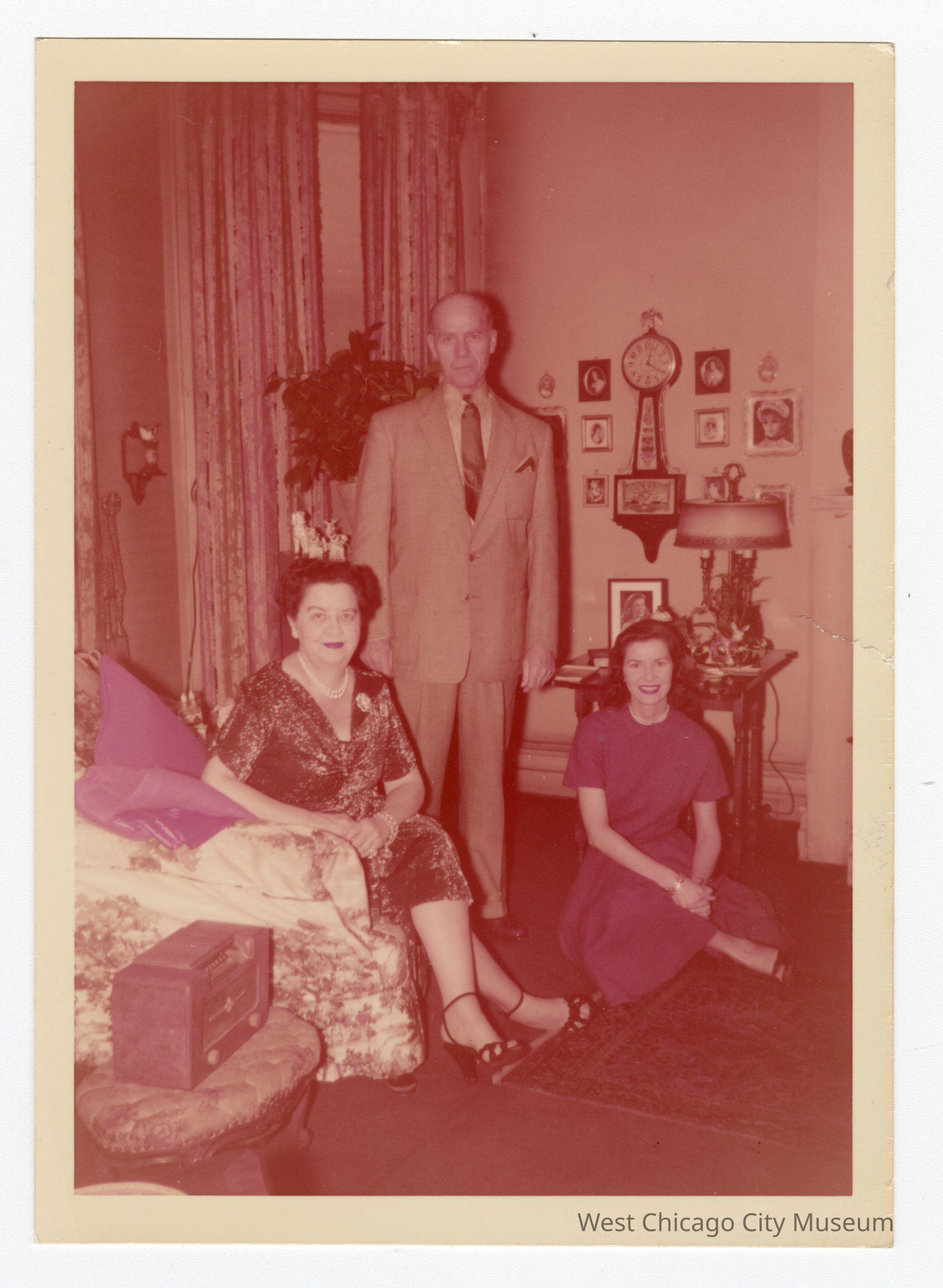 Redd monotone photograph with white edge. Man standing in center in suit and tie with woman on left sitting on couch and woman on right sitting on ground. Radio in bottom left corner. Plant behind man on left. On right clock with framed photos on wall around it and below it table with lamp and portrait. Window with curtains on left in background. On back stamped This is a Kodacolor Enlargement Made only by Kodak Week of May 4 – 57 RCollection