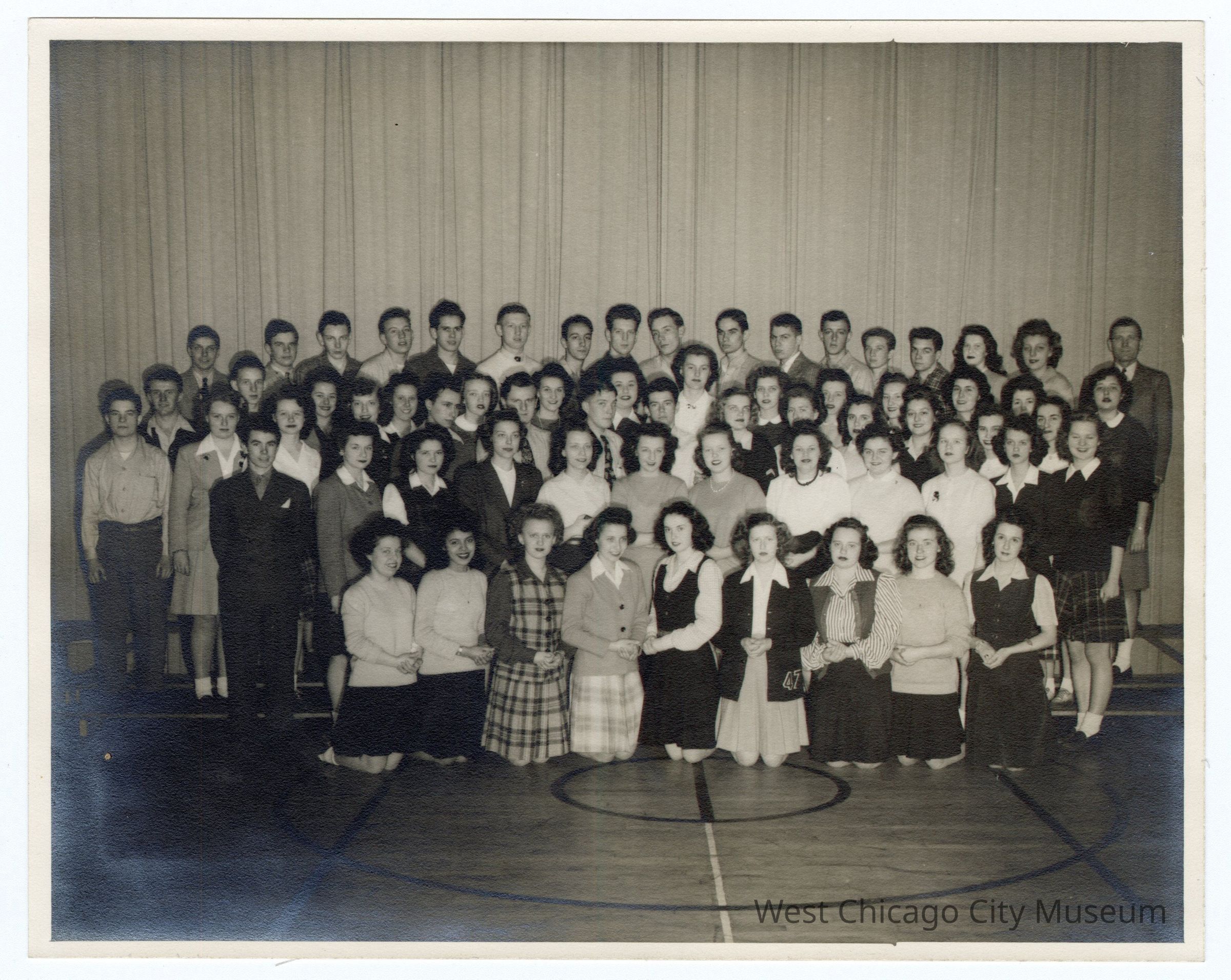 Black and white photograph with white edge. Taken at a sports court with markings on the floor and curtain in the background. 5 rows of people. Front row kneeling and hands clasped before them, all women (9), next row up all women except one man on left (12), next row up and one behind it hard to differentiate, last row all men except two girls second and third from right. On back stamped Lewis H. Stafford photographer Phone 1089 Wheaton IlCollection