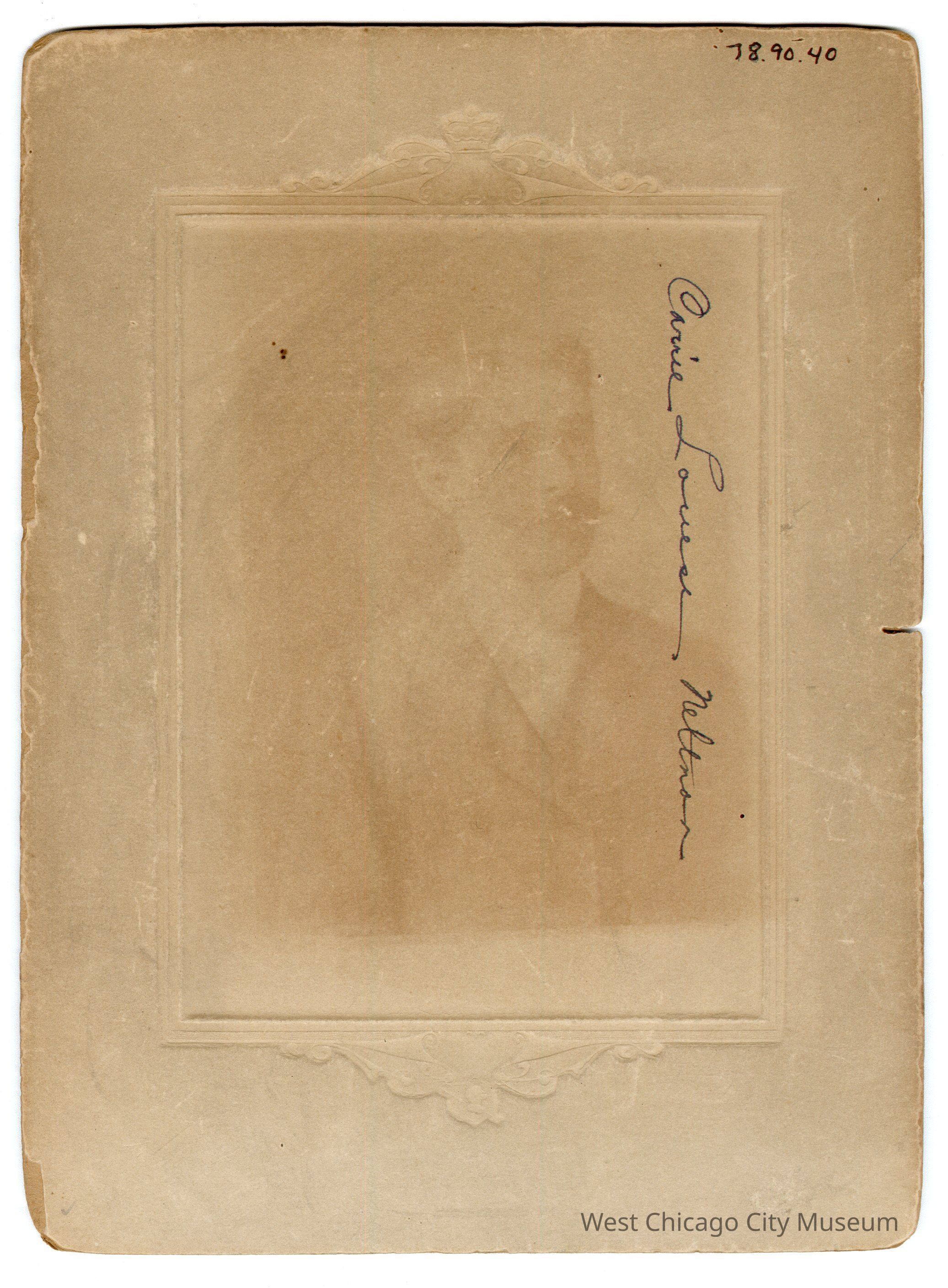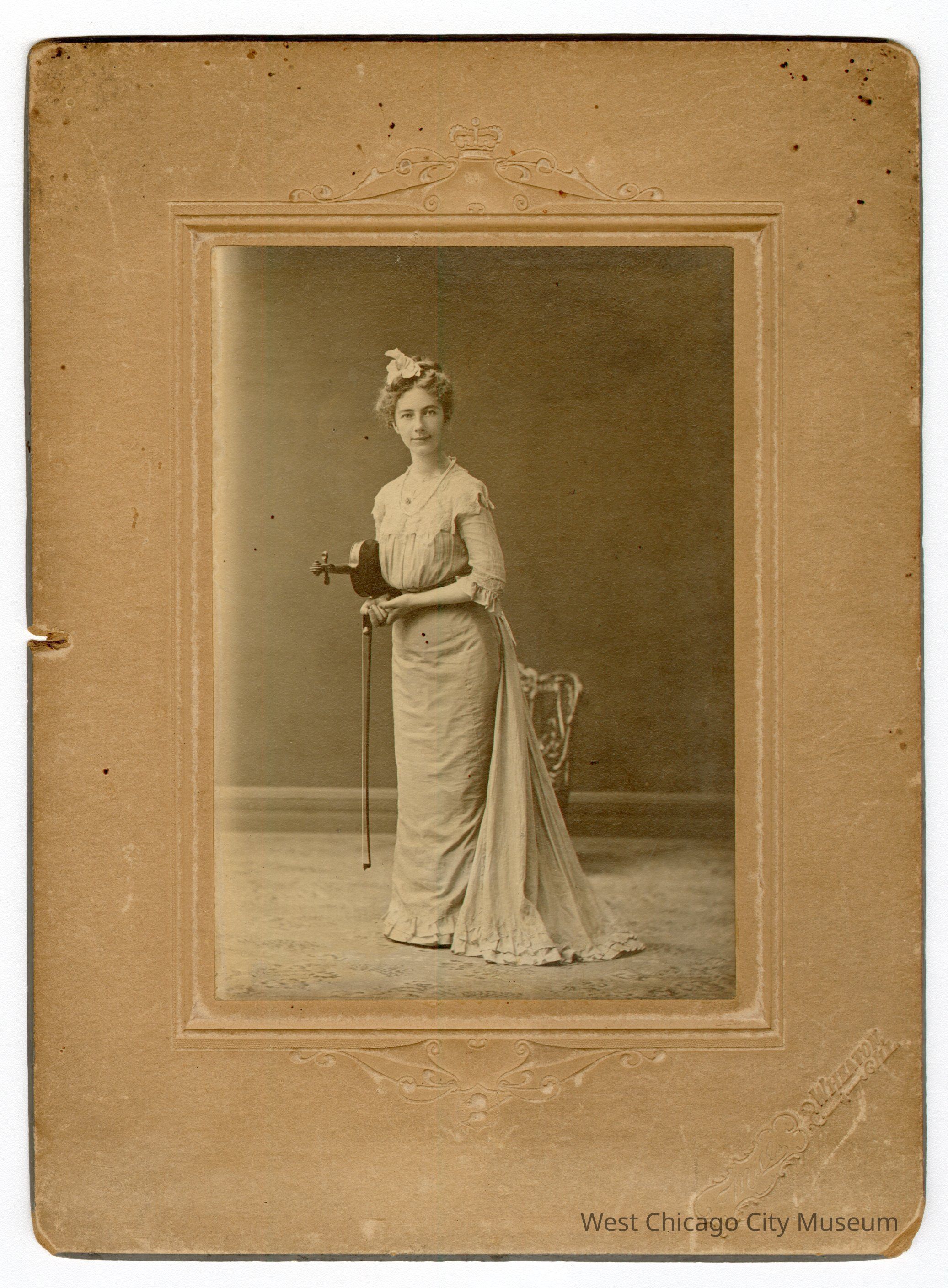 Photo, b&w, Caroline Louise Neltnor, nd., c1900, holding violin bow, violin tucked under right ar. Taken at Mills Studio, Wheaton. 6 1/2" w x 8 3/4"h. written in blue ink on reverse: Carrie Louise NeltnorPhotograph Details