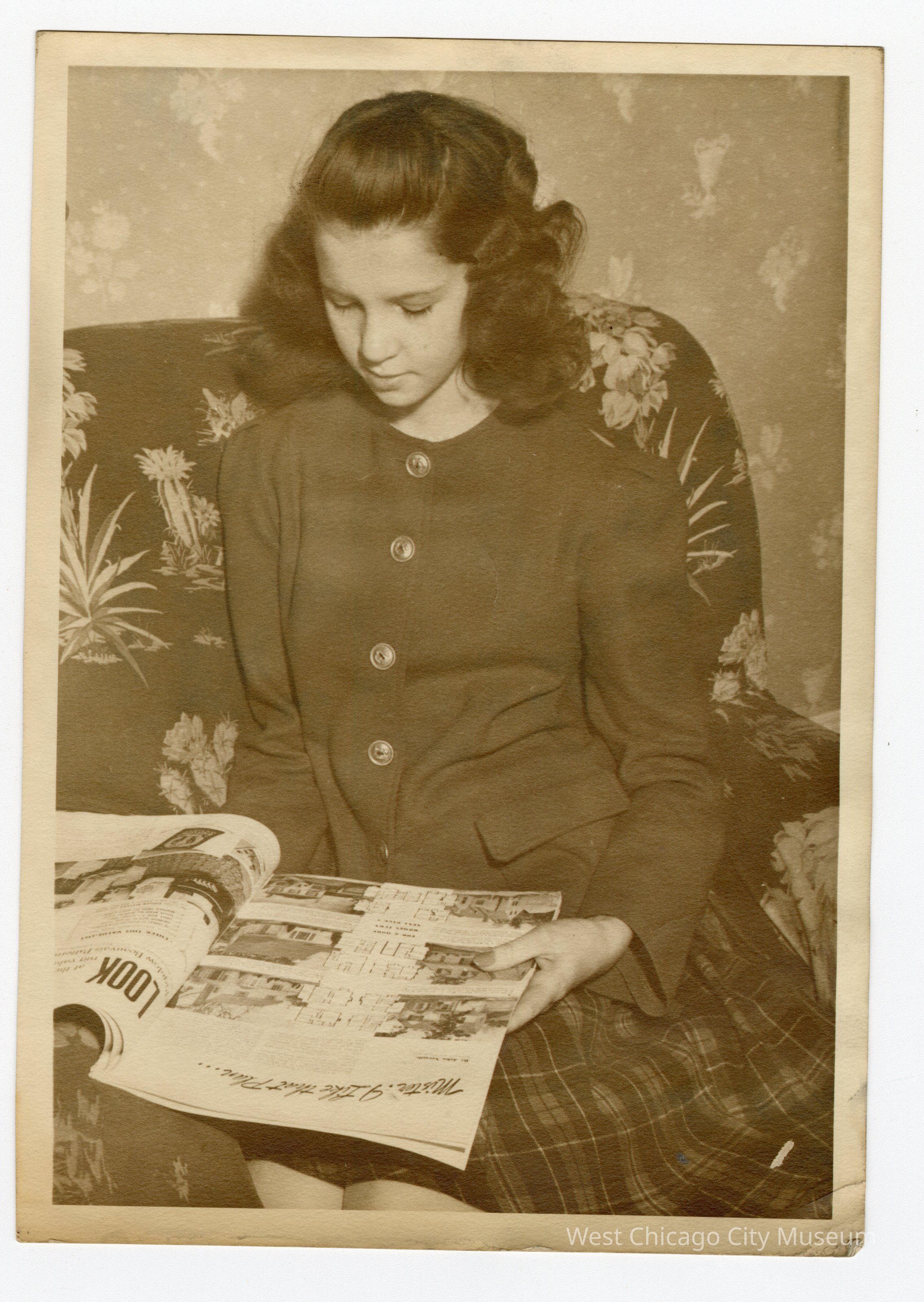 Sepia photograph with white border. Girl sitting on flower and cactus print chair in buttoned cardigan with plaid skirt and painted nails looking at magazine. Her left shoulder is closer to the camera and she’s angled slightly. On back January 19, 1941 along top edge handwritten.Collection