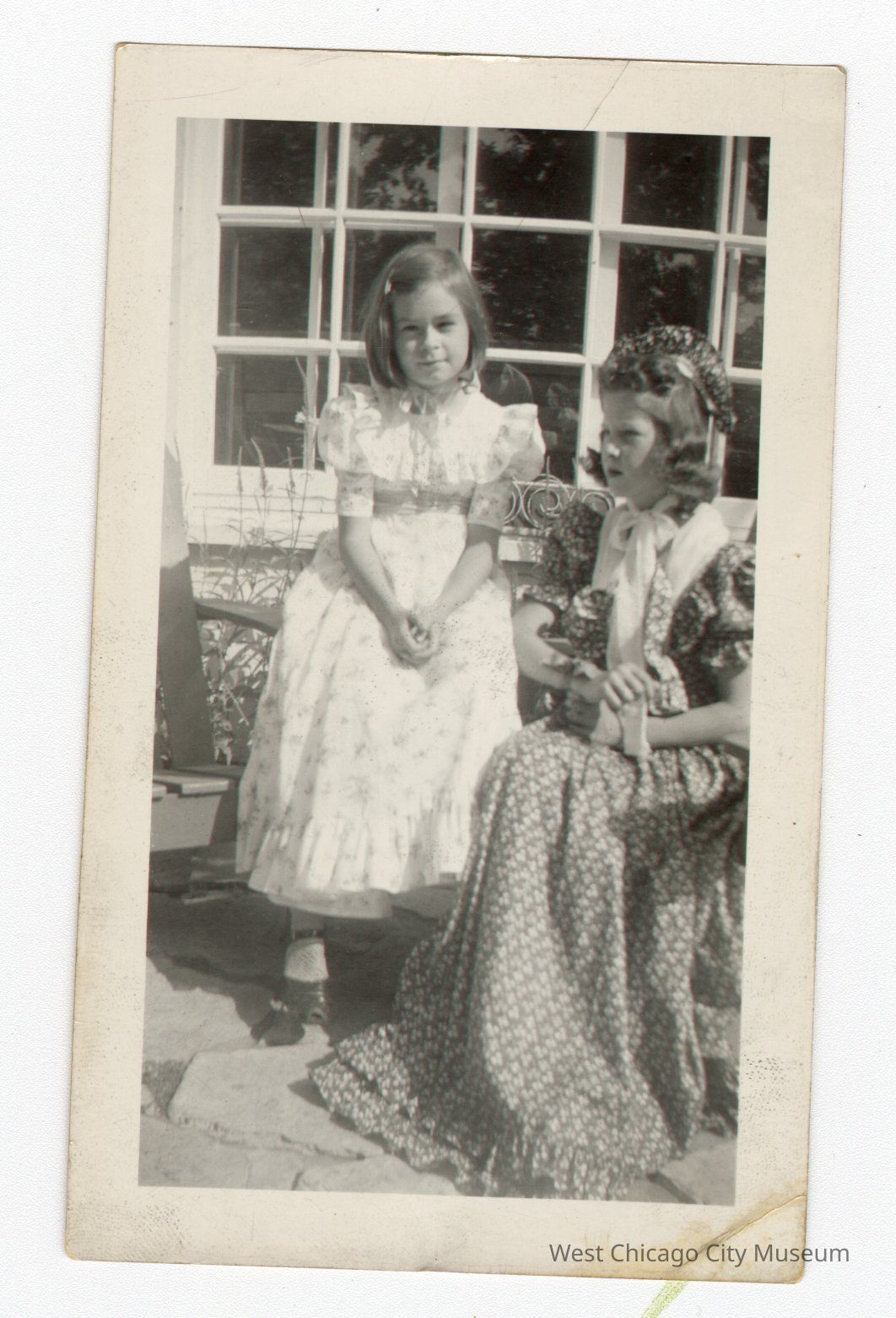 Black and white photograph with white border. Two girls, one on left in white dress sitting on something looking directly at camera, hands clasped before her. One on right facing left with her left arm cut off edge of photo. Also in dress, looks like something on head. Windows in background. Hands clasped in lap. 964 on back.Collection