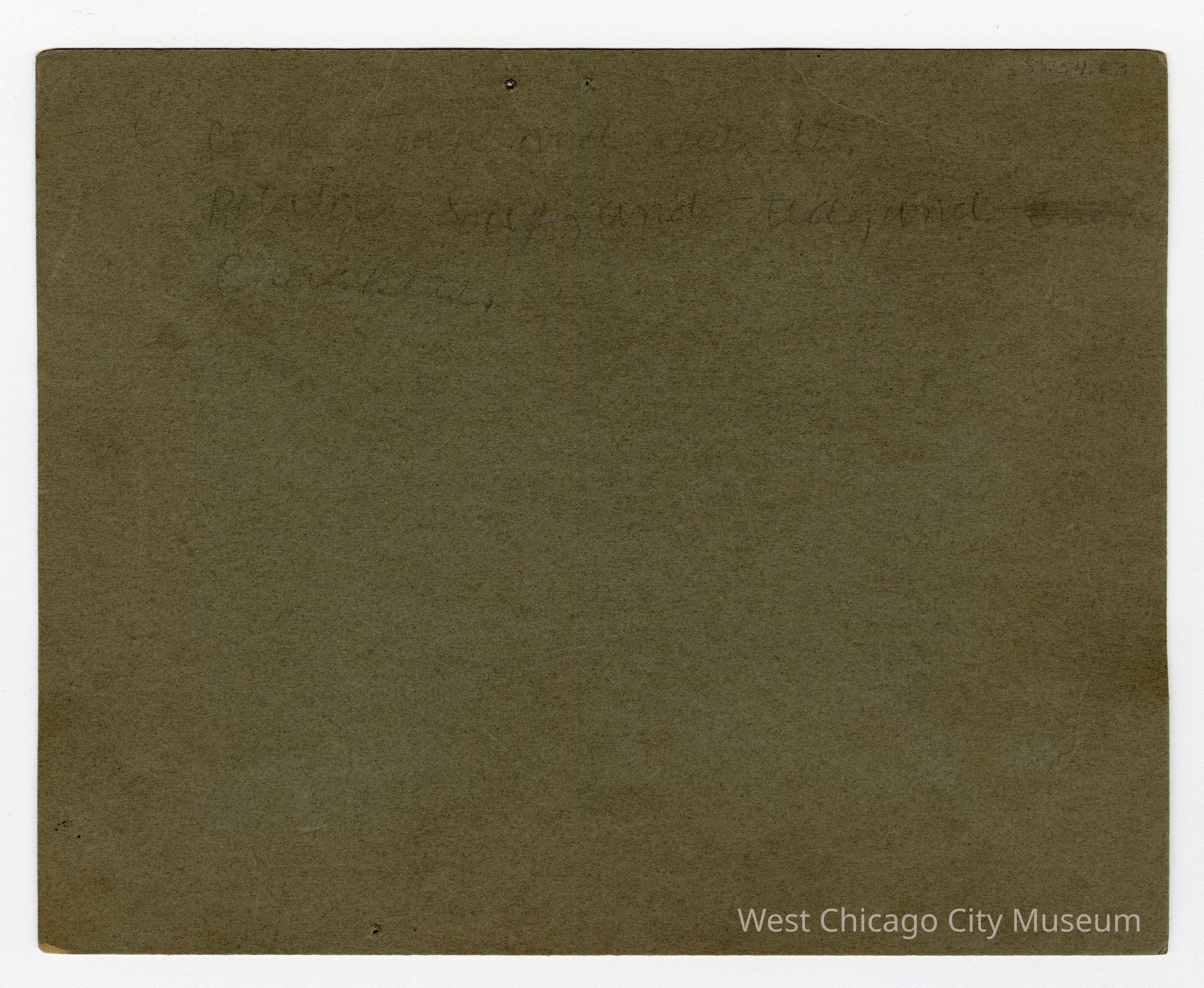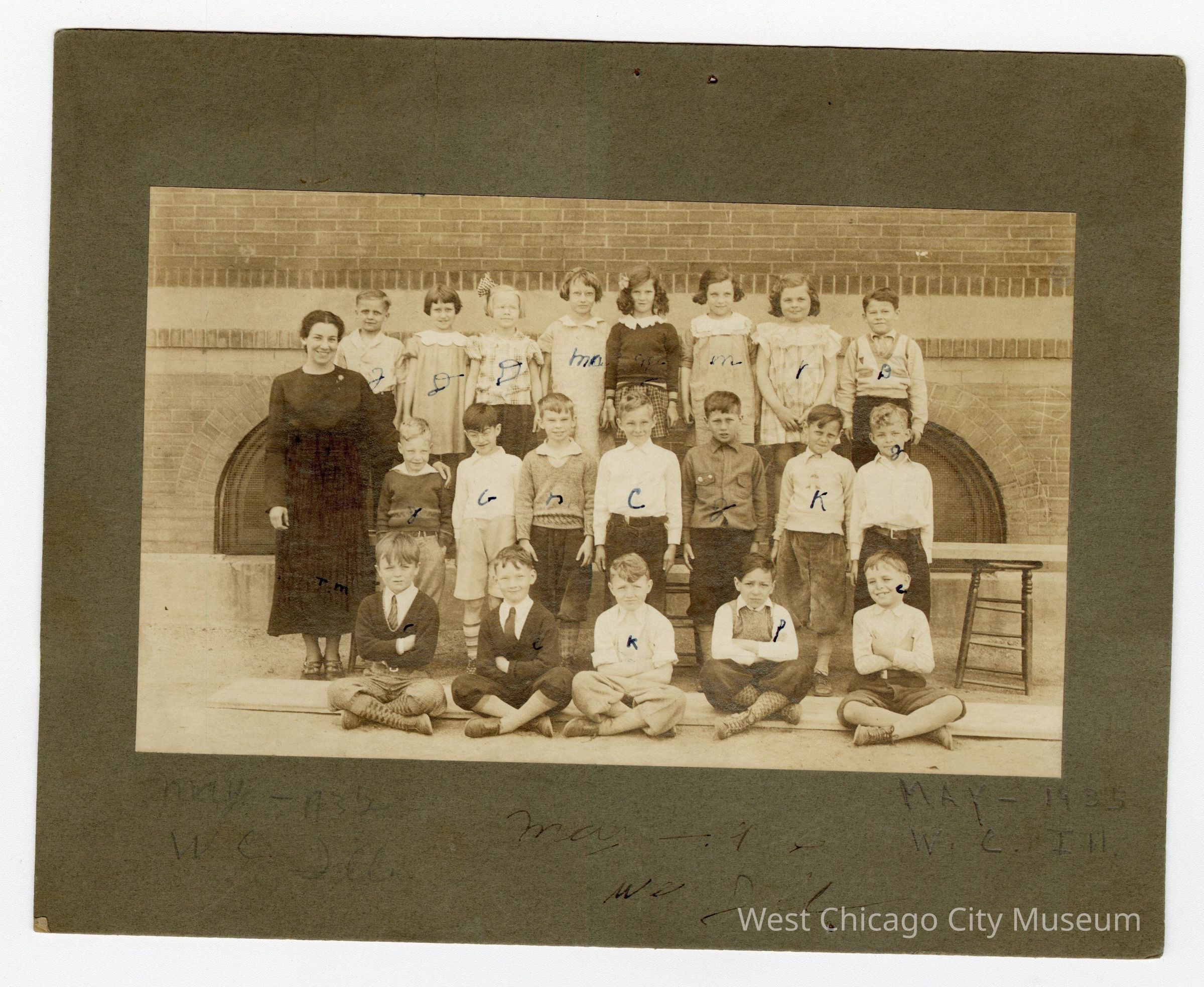 Sepia photograph pasted on dark cardboard backing with border. School photo, teacher in all black on left with T M written on skirt. Children in three rows each with letter written on them somewhere. 8 kids in top / back row, 7 in middle, and 5 in front. All boys in front row sitting cross legged with arms also crossed. All boys in middle row, and a boy on each end in back row but rest are girls. Plank resting on barstool chairs in back row that kids are standing on. Kids in middle row standing. Writing on bottom and back.Collection