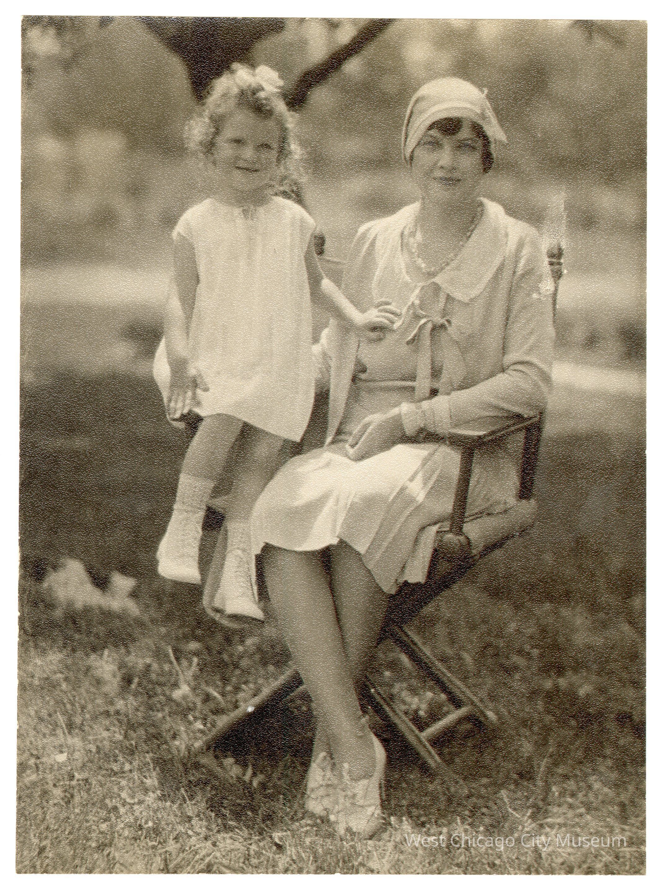 Black and white photograph of woman sitting in director’s chair wearing a knee-height outfit with a hat, looking directly at camera. On left young girl is sitting on arm of chair with hand resting on chest of woman, to the left of woman. Girl’s right hand is resting on arm of chair. Girl is in a white outfit with bow in hair and white shoes with socks. Tree in background directly behind girl.Collection