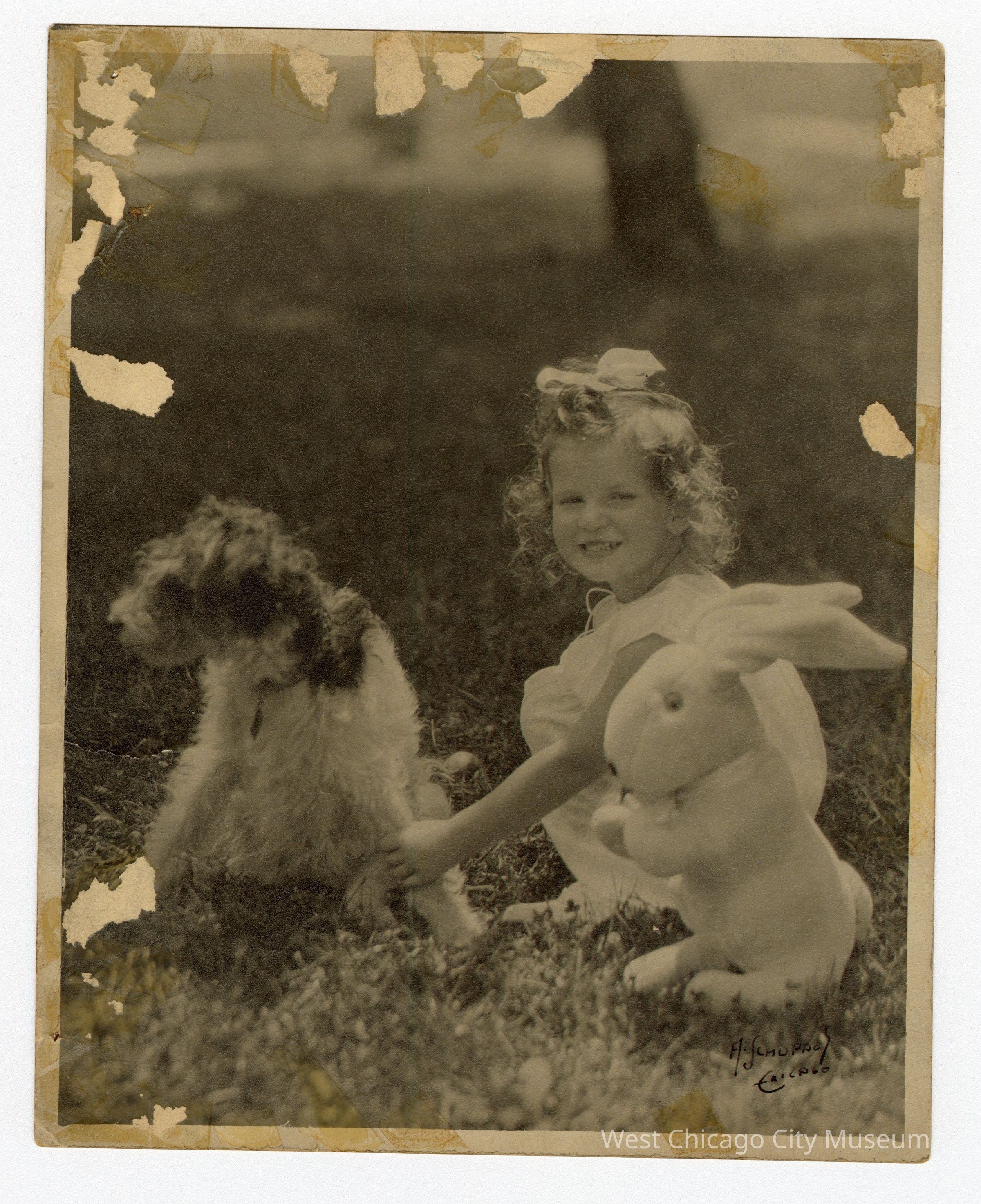 Black and white photograph with white border. Girl with white bow in hair and in white dress squatting on grass with her left shoulder closer to the camera. She’s holding a dog’s left front leg in her grip. The dog is on the left and looking left. There is a white plush bunny before the girl, facing left. Tree trunk in background above girl.Collection