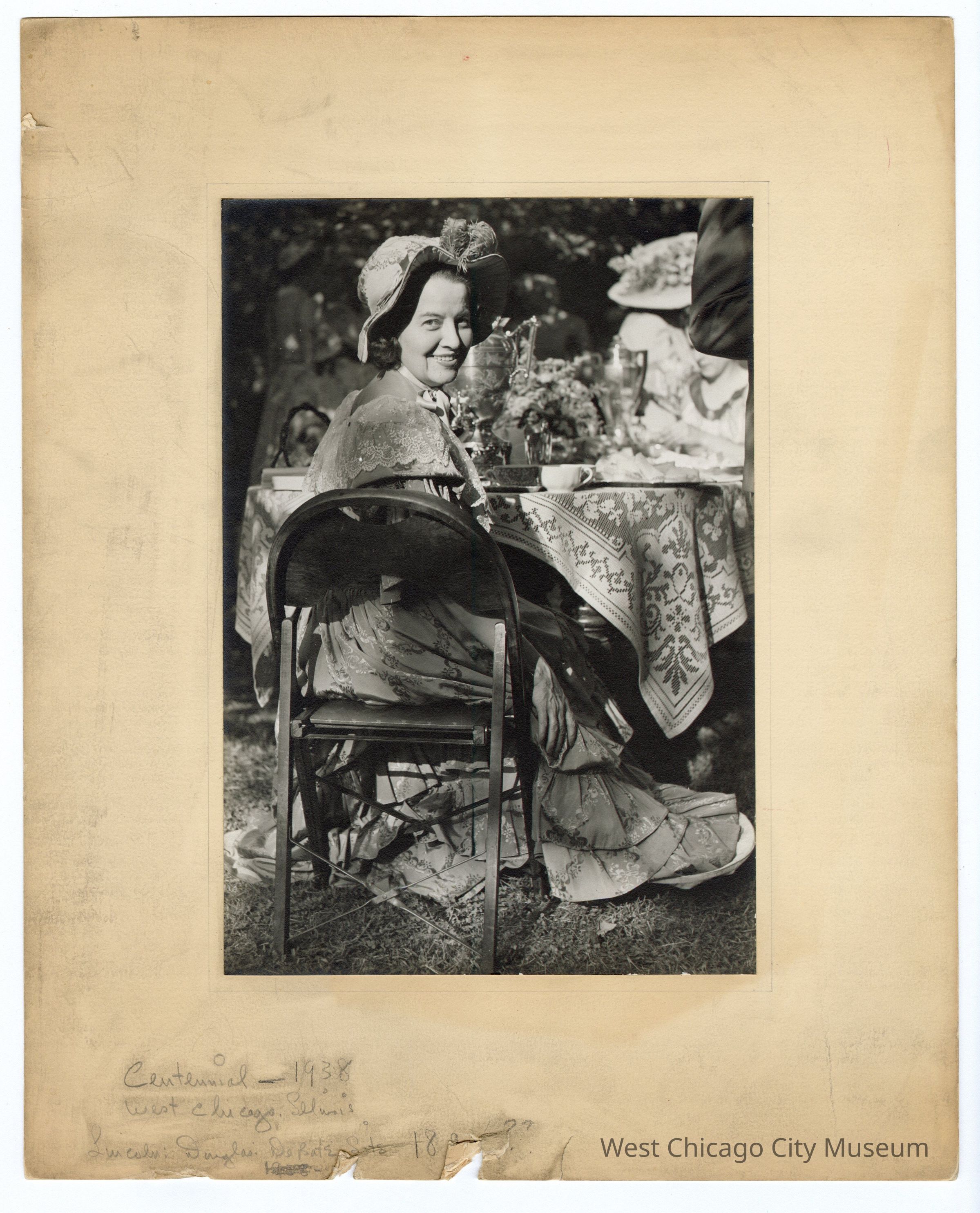 Black and white photograph on matting. Woman sitting on foldout chair looking back at photographer over right shoulder. She’s waring a hat and smiling. Table in front of her with tea cups. Dress is pooled around her feet. Tablecloth looks cross stitched. Bottom left corner handwritten in pencil and smudged: Centennial – 1938 West Chicago Illinois Lincoln: Douglas [illegible] and bottom edge torn and ripped.Collection