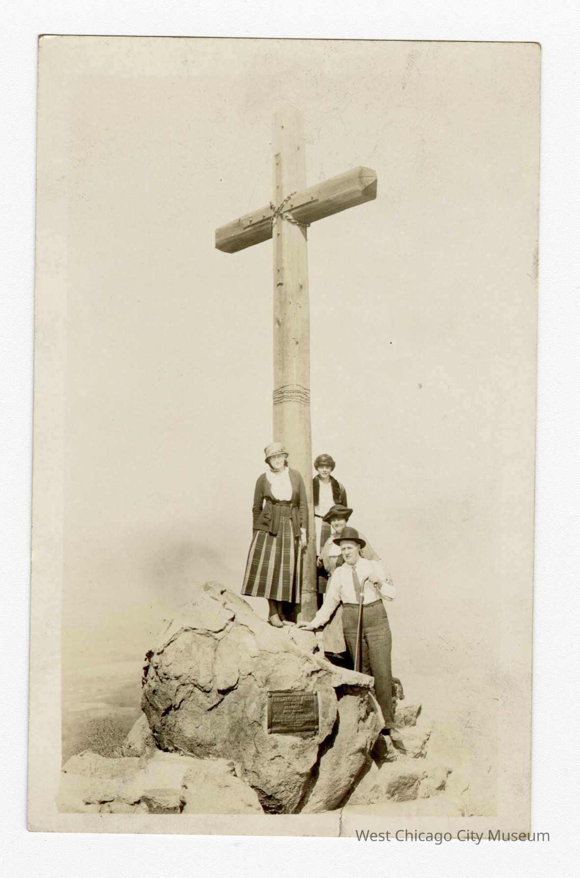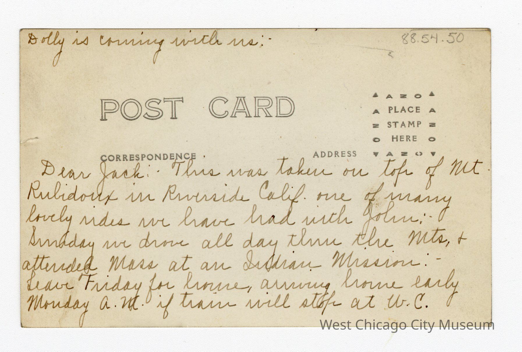 Black and white post card. Four people standing in front of a cross jutting out of stone. Three women and one man in front with cane and his right hand on rock. All wearing hats. On back: “Dolly is coming with us” in top left corner, then written message is: Dear Jacki This was taken on our Tour of Mt Rubidoux in Riverside Calif. One of many lovely rides we have had with John: Sunday we drive all day thru the Mts, + attended Mass at an [illegible] Mission: Leave Friday for [illegible], arriving home early Monday A. M. if [illegible] will stop at W.C.Collection