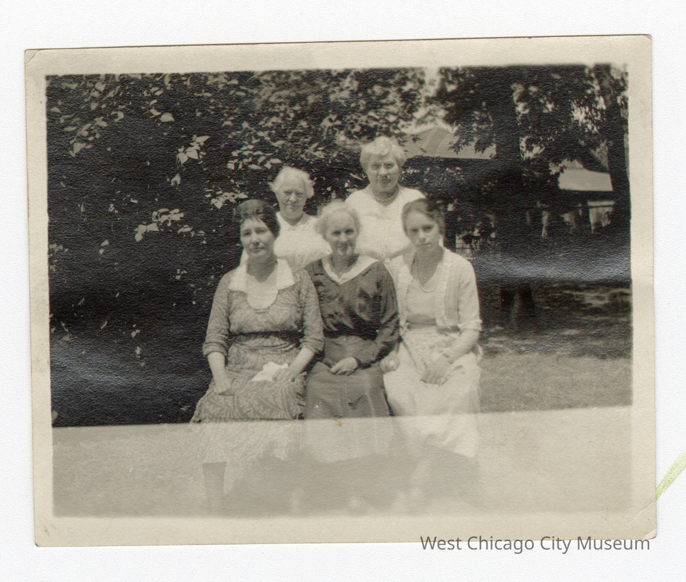 Black and white photograph with white edge. 5 women, three in front row and two in back standing in the “windows” of space between them. Two women on left in front row in darker dresses, rest in white dresses. Bottom quarter of photo faded. Trees and house in background.Collection
