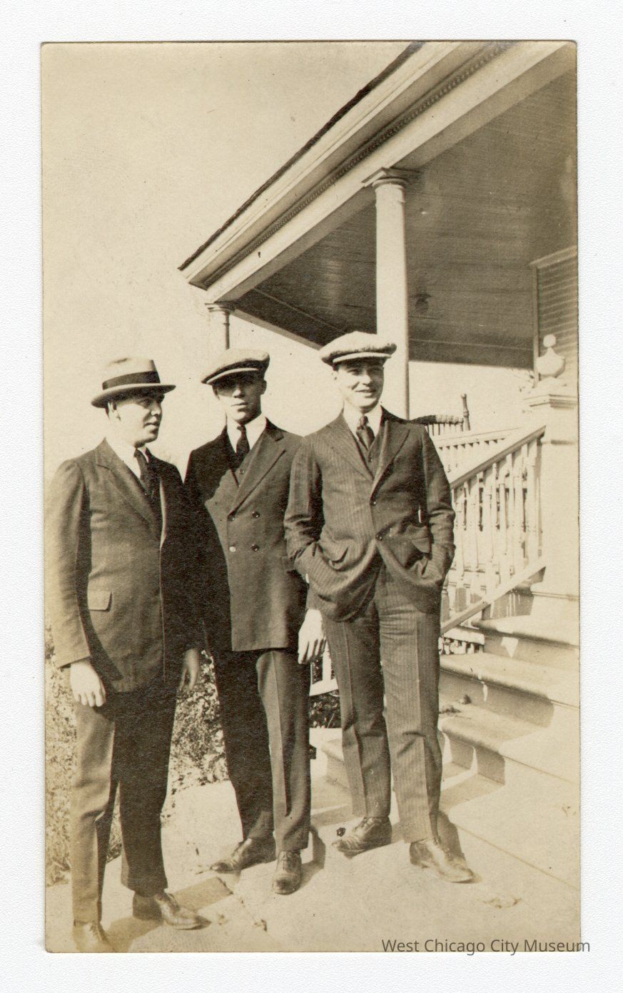 Black and white photograph. Three men standing shoulder to shoulder in buttoned suits wearing hats. One on right has hands in pocket. Man in middle looking straight at camera and slightly behind other two. Man on left looking to the right. Stairs on right leading up to porch and house in background.Collection