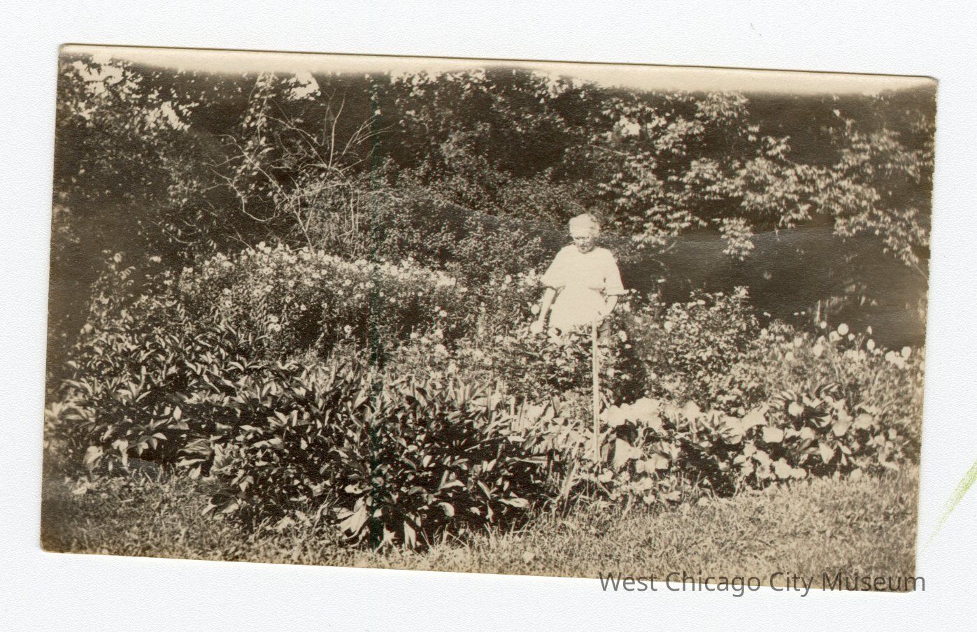 Black and white photograph of woman in white with sleeves rolled to elbows standing in garden. She’s looking down and to the left. Bushes and trees in background. Grass in bottom right corner. Plants block her lower half, but her waist is visible. Handwritten on back in top left corner Sept 5 – 1921.Collection