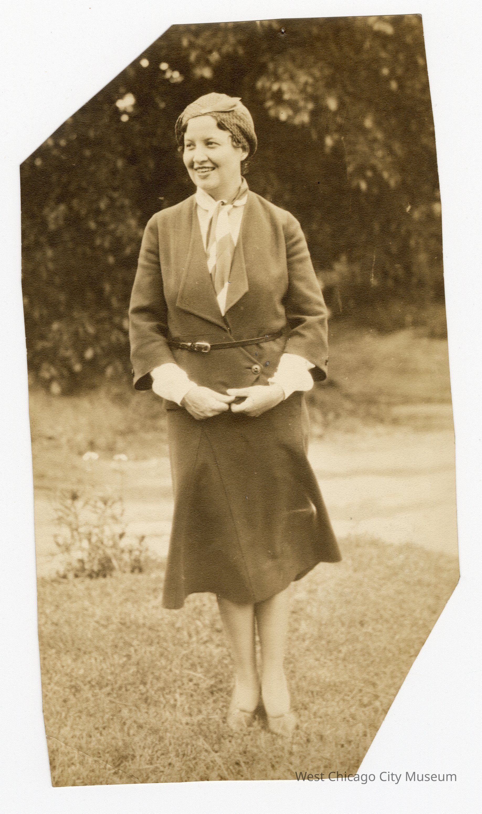 Sepia photograph. Woman with knee-height dress and belt with hands clasped in front of her (almost, fingers barely touching), looking to the left and smiling with teeth. The top left and bottom right corners are missing. Trees in background. She’s wearing a hat. On back, handwritten D-813Collection