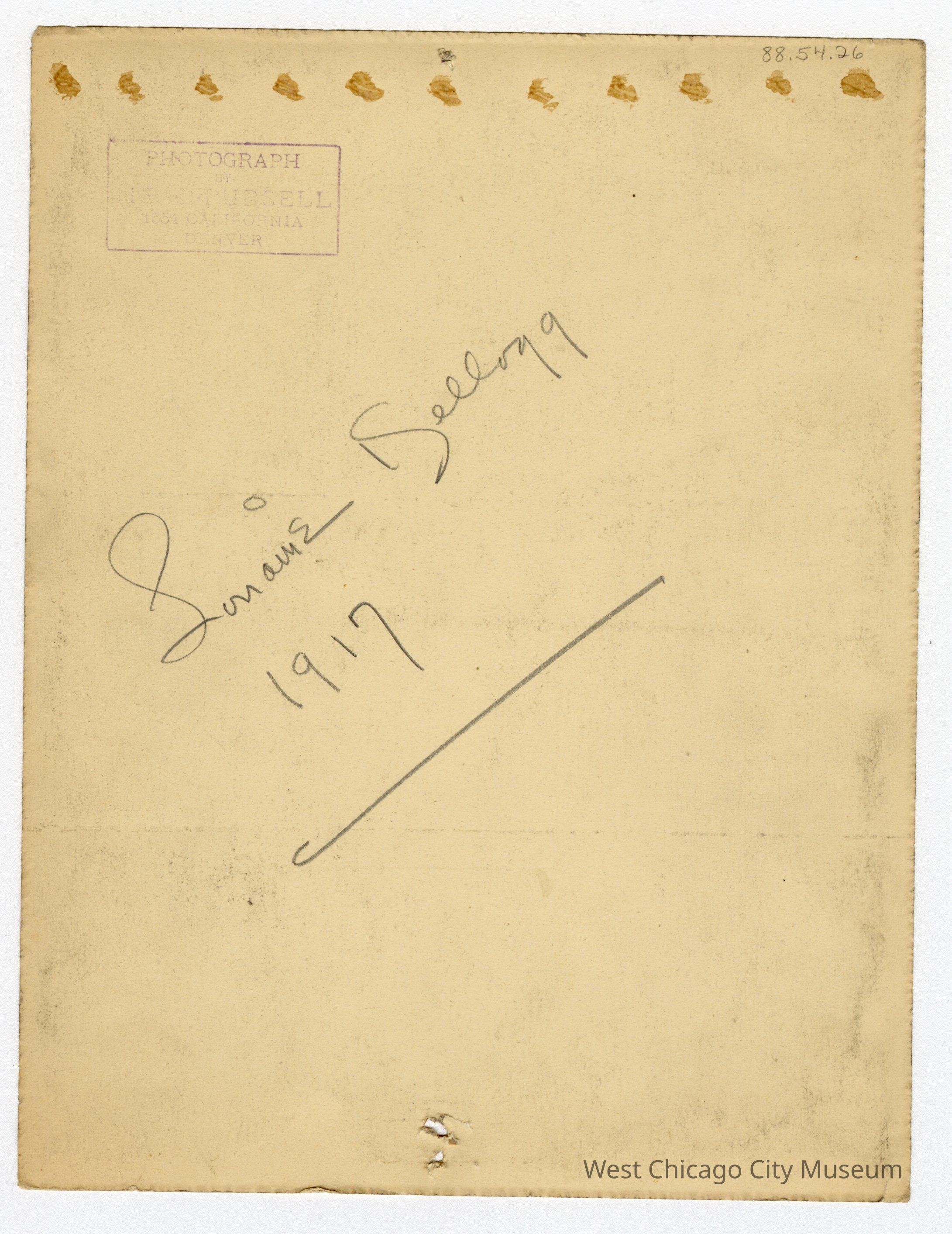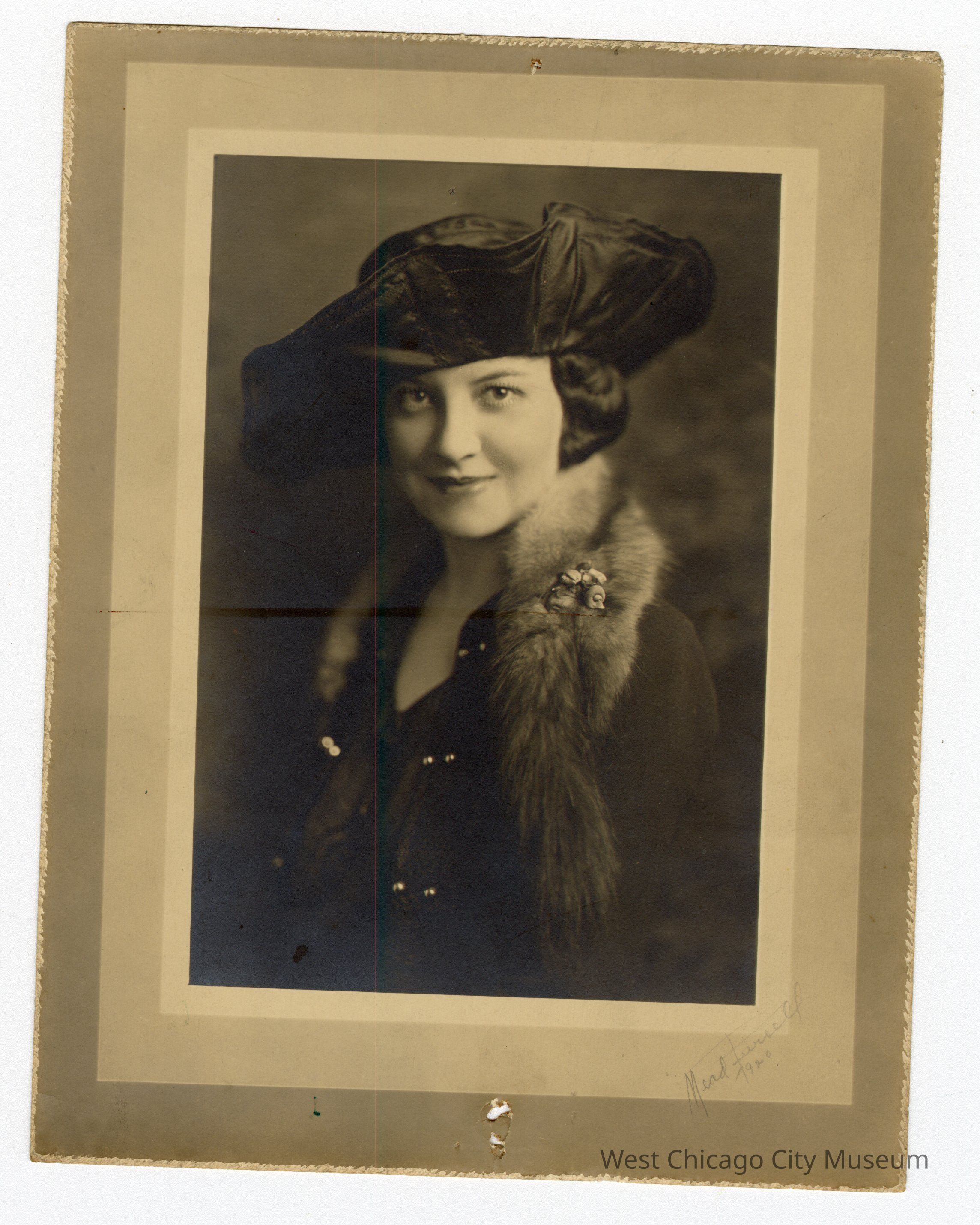Black and white photograph with three different colored borders with the very edge looking slightly scratched off. Woman wearing black hat with her left shoulder closer to camera looking directly at camera. Fur scarf. She’s smiling without her teeth and has dark hair that goes down to her jawline. Name written in diagonal in bottom right corner with 1920 under it. Stamp on back in top left corner, and written below it on angle Loraine Kellogg(?) with 1917 under it, and then the year underlined.Collection
