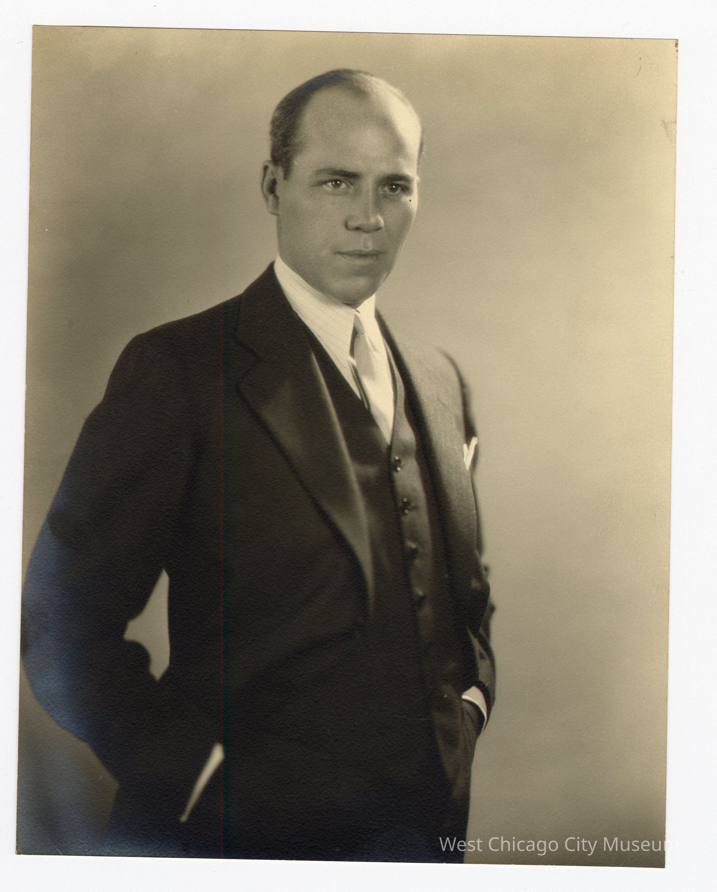 Black and white photograph. Man standing slightly at an angle with his right shoulder closer to the camera. He’s in a three-piece suit, unbuttoned, with his hands in his pocket. He’s wearing a tie. Slightly balding. His right elbow is slightly cut off along left edge.Collection
