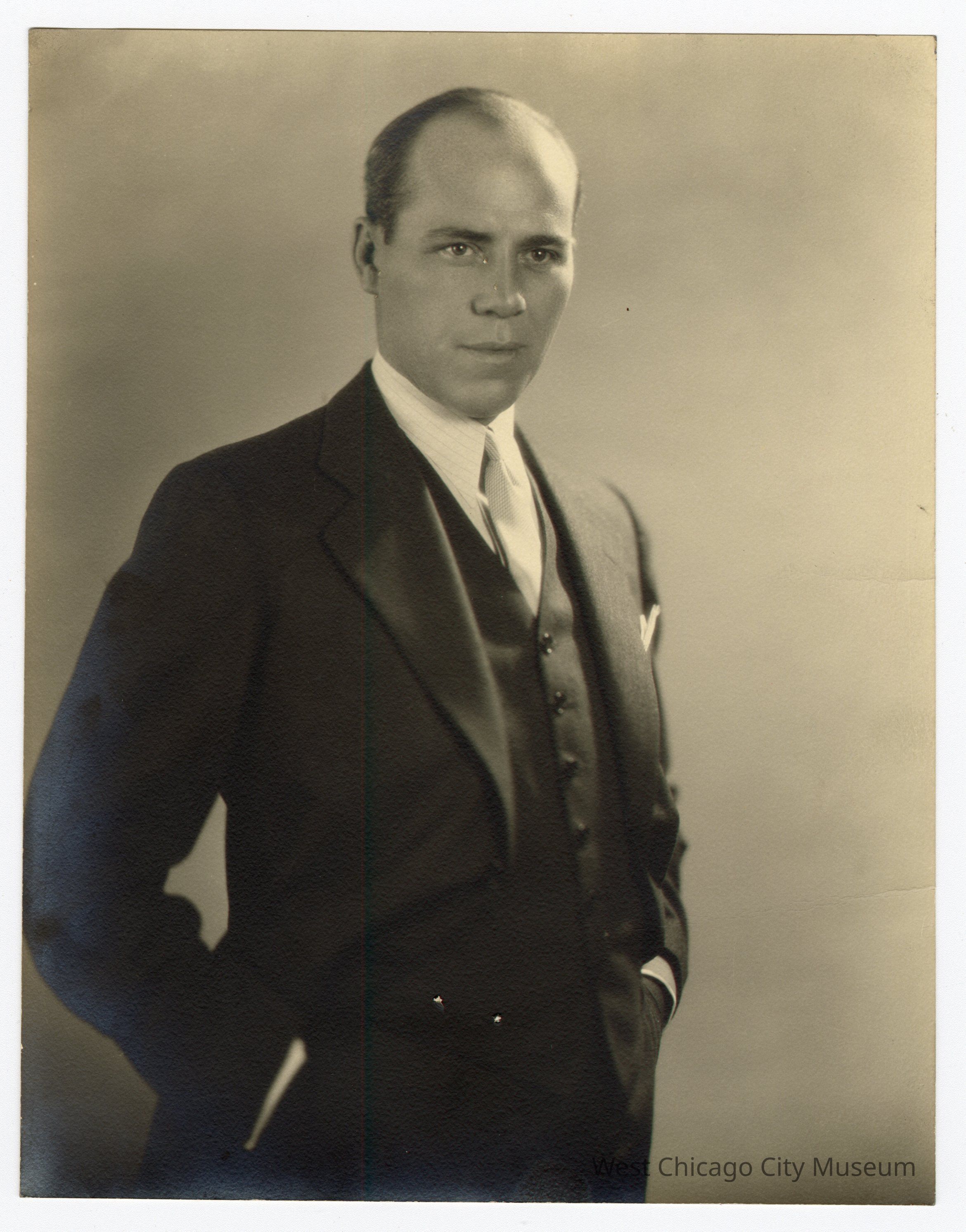 Black and white photograph. Man standing slightly at an angle with his right shoulder closer to the camera. He’s in a three-piece suit, unbuttoned, with his hands in his pocket. He’s wearing a tie. Slightly balding. His right elbow is slightly cut off along left edge.Collection