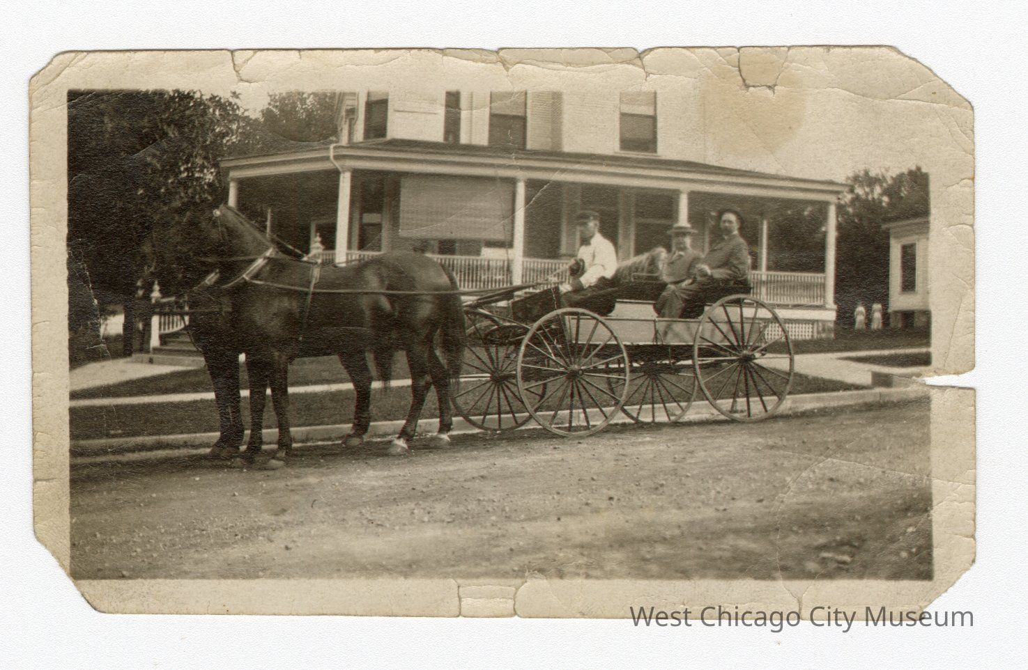 Black and white photograph with white border. All corners missing , rip on right side and tears along top and bottom. Buggs with two horses facing left. Horse closer to camera has coronet markings on both hind feet. No other visible leg markings on either horse. Three people sitting in buggy, man in front wearing cap and white shirt, and two men in darker suits and caps in back. House in background with wrap around porch. Wheels are approximately at level of horse’s ischium bone. On back: “Tye” handwritten and sticker with number 57328.Collection