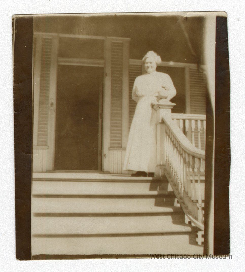 Black and white photograph. Woman in white dress standing at top of stairs on porch and door to house is behind and to the left of her. Her hands are behind her back, with her elbows jutting out to the side slightly.Collection