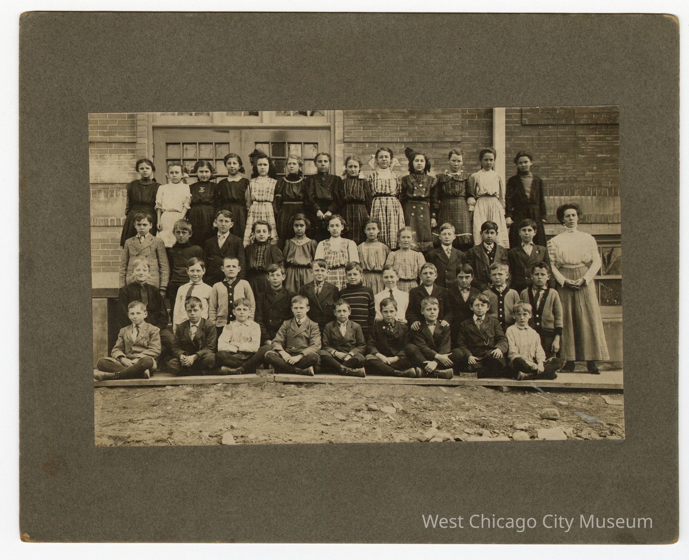 Black and white photograph with grey matting. School photo. Adult standing on right in white blouse and darker skirt with hands clasped in front of her. The children are in four rows. They are all sitting cross legged in the first row, kneeling in the second, and standing in the third and fourth rows. The front row is all boys, second row is also all boys, third row is a mix of boys and girls (b, b, b, g, g, g, g, g, b, b, b, ), and top row is all boys. There are 44 children in total, 18 girls and 26 boys (not counting the teacher in this count). 9 in the first row, 11 in the second, 11 in the third, and 13 in the fourth. Front row the 3rd boy from the right has the hands of the boy behind him on both his shoulders (that boy is the fourth from the right in the second row). Third boy from the left in the front row has his arms crossed.Collection