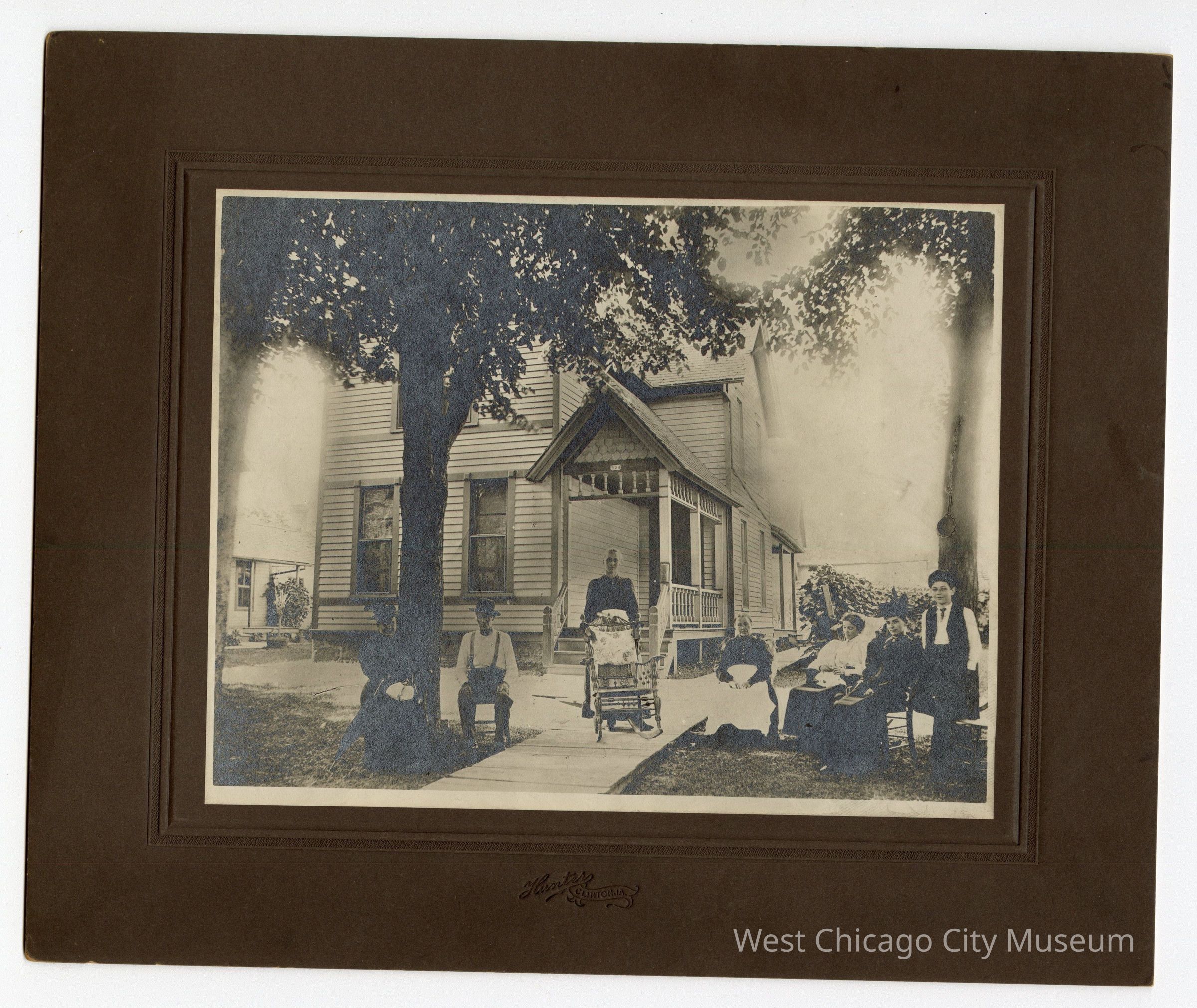 Photograph in a mat frame. Black and white. 7 people in front of a house that has the number 724 on it. From left to right: woman in all black with umbrella and hat and what may be a white purse on her lap. She’s sitting in a chair. There’s a tree between her and the man to the right of her. He’s sitting in a chair with his hands in his lap, wearing a long sleeve white shirt with dark pants and suspenders and a hat. Woman to right of him standing behind a wooden rocking chair in center of walkway in line with the rest of the people all sitting and standing in a row. Woman to right of her sitting with a large white cloth in her lap, hands resting in the middle of her lap. Woman to right of her sitting and only one not looking at photographer and instead looking at her hands which are connected in front of her. Her top is white and bottom is dark. Woman to her right is sitting close next to her in long dark dress and also wearing a hat. Boy leaning against a tree to the right of her along right edge of photograph with his right leg propped up on trunk of tree behind him. Engraving on bottom of brown-ish mat: Hunters Clinton.IA.Collection