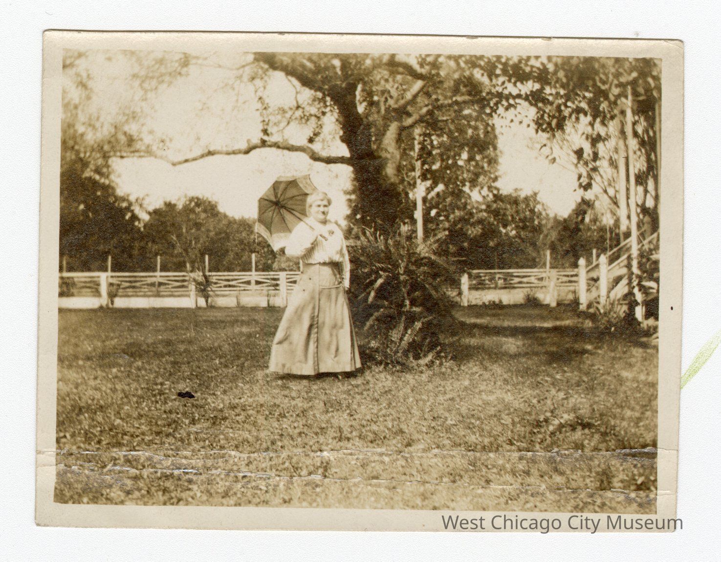 Black and white photograph with white border. On back top left Feb 22 1915. Woman standing in front of and slightly left of tree holding an umbrella over her right shoulder. She is standing slightly angled to the right and looking at the camera. Fencing in the background, and along the right edge what looks like stair banisters. Woman is wearing long sleeve white blouse and slightly darker colored skirt. Bottom of photo is wrinkly.Collection