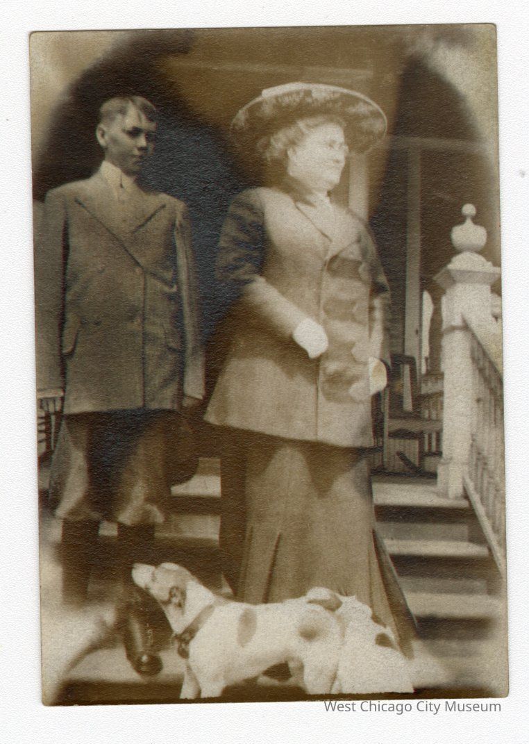 Black and white photo of two people standing on stairs with digs at their feet. Woman on right with glasses and wearing a hat looking right and Boy on left in buttoned suit also looking right. Dogs are white with large spots and come up to just under their knee height.Collection